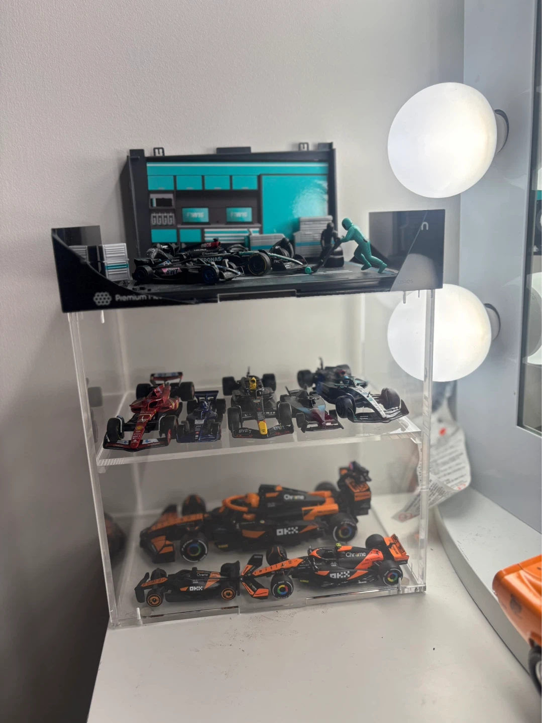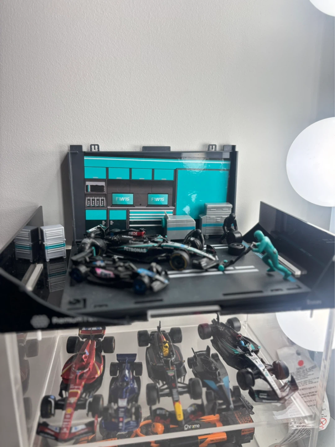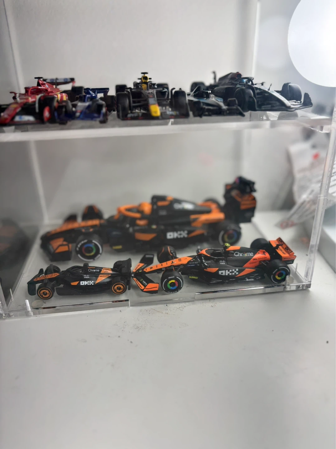 Collection of various Formula 1 diecast model cars. Includes McLaren F1 cars with OKX and Chrome branding. Also features other F1 models and a pit garage diorama with figures. Great for display! Hotwheels , diecast and LEGO
