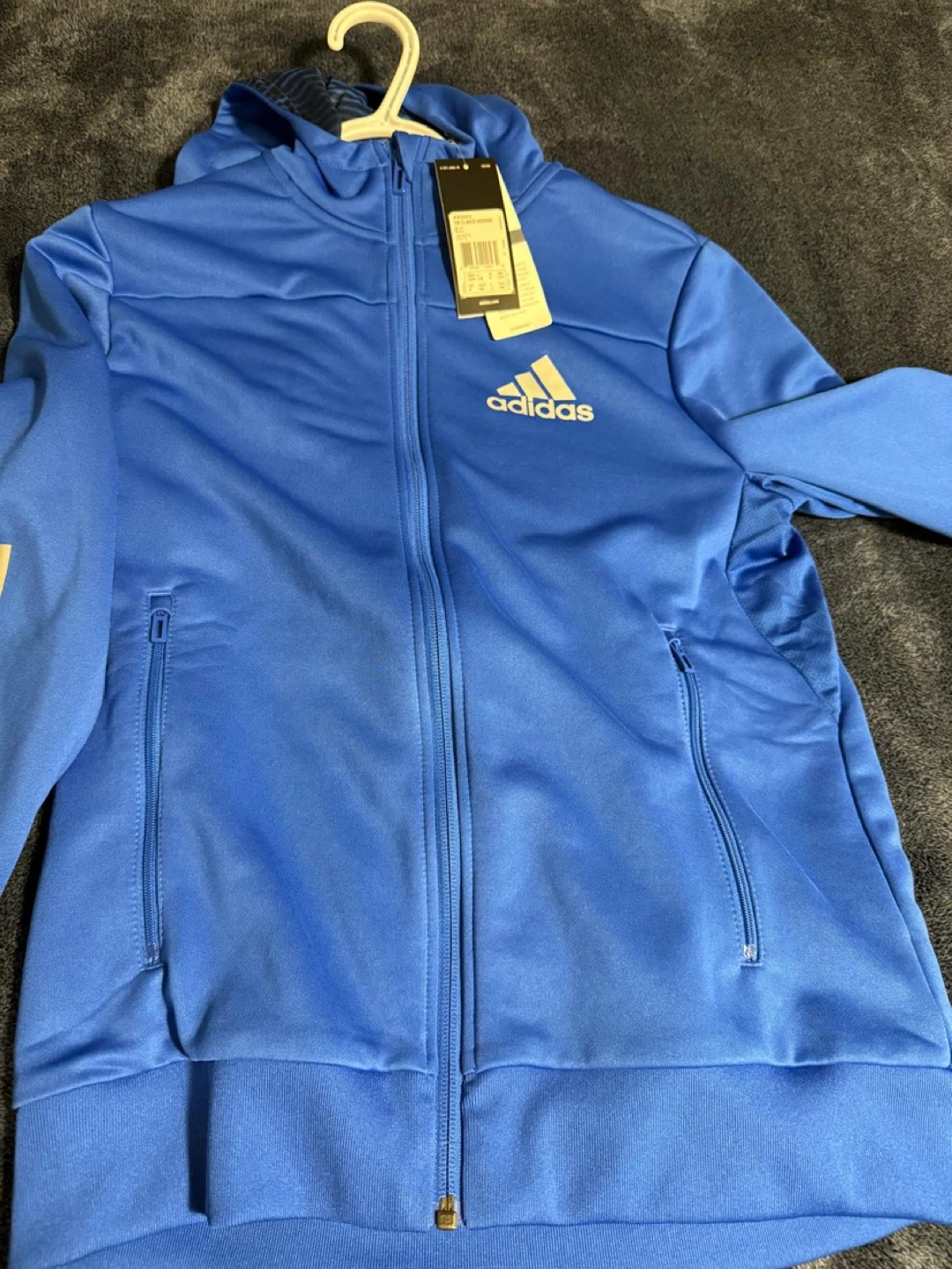 This is a royal blue Adidas full-zip hoodie with the iconic three stripes on the sleeve. It features a full zip-up front and pockets. It's made from a polyester blend fabric.