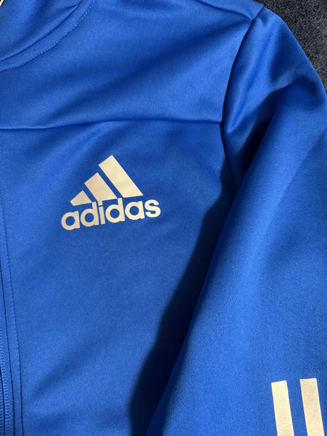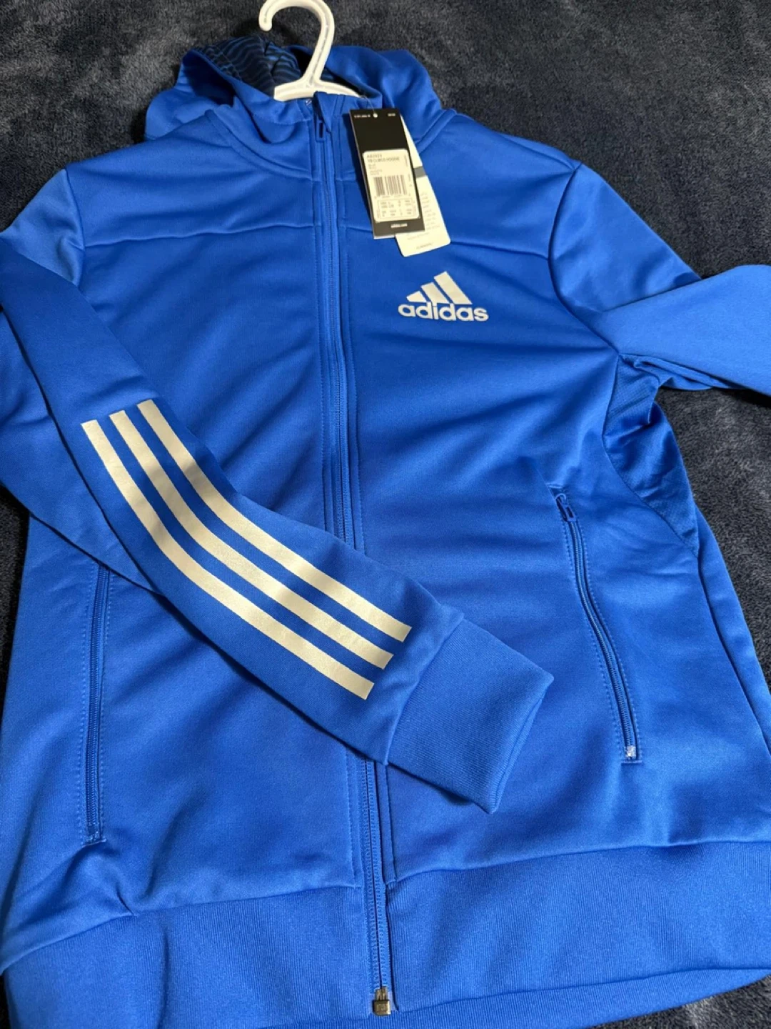 This is a royal blue Adidas full-zip hoodie with the iconic three stripes on the sleeve. It features a full zip-up front and pockets. It's made from a polyester blend fabric.