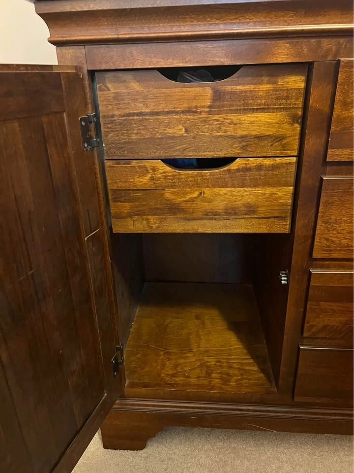 This dresser is in good condition. The dresser looks oranger than it is in the picture. Was bought for a changing table and dresser. It is 52 inch’s long, 19 3/4 inches deep, 37 inches high.