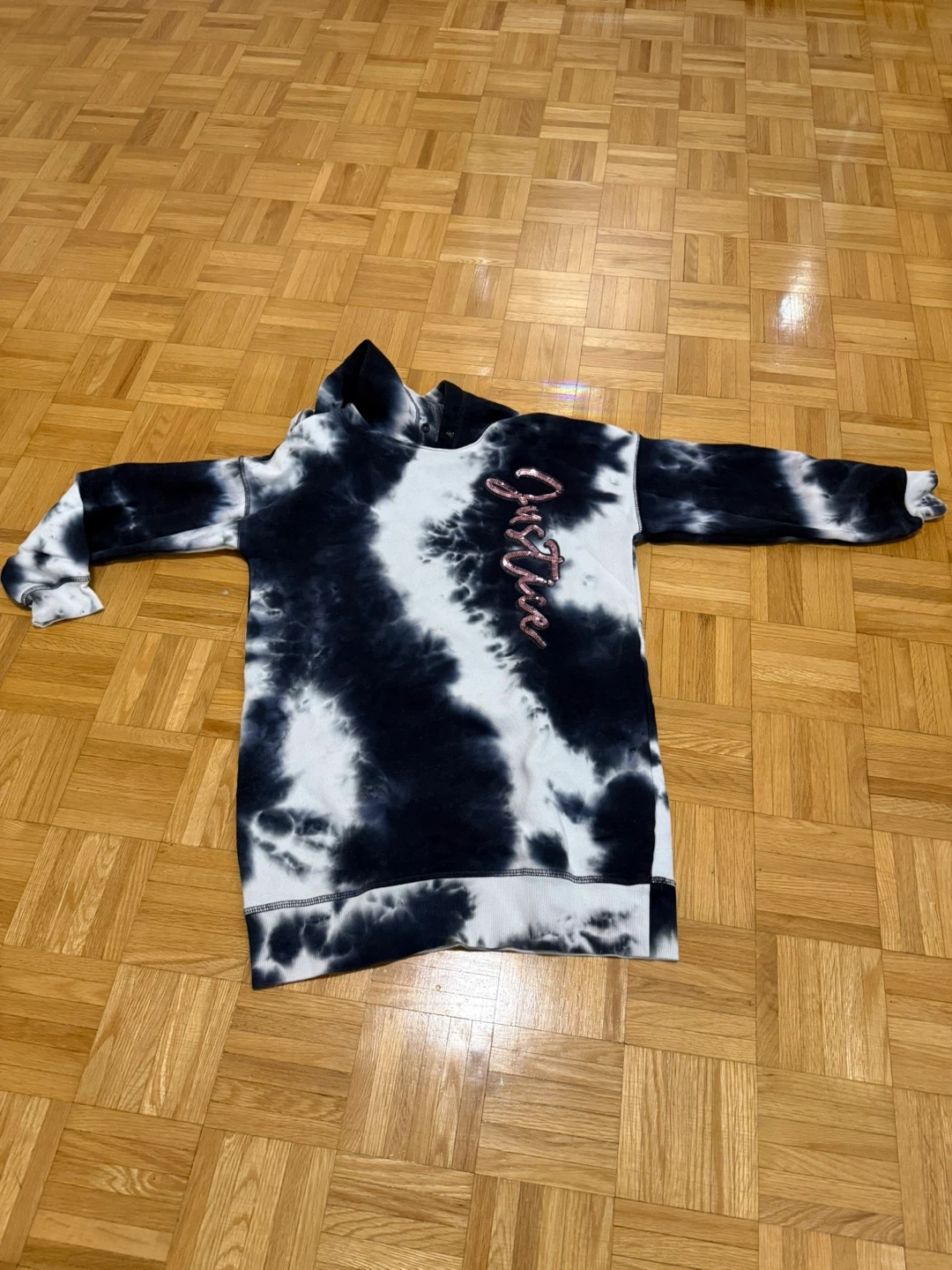 This cool hoodie features a black and white tie-dye pattern. It's got 'Justice' written on the front in sparkly pink letters. It's a long-sleeved hooded sweatshirt.