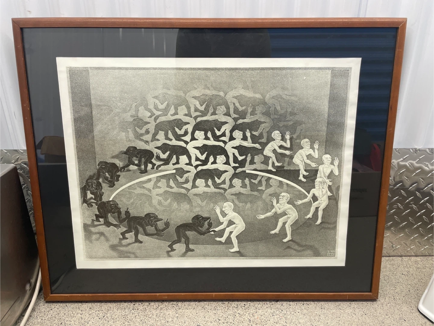 Selling a framed print of "Encounter" by Dutch graphic artist M. C. Escher, created in 1944 during World War II and is sometimes seen as a message of hope. The glassed frame is wood and measures approximately 29 inches by 23 inches