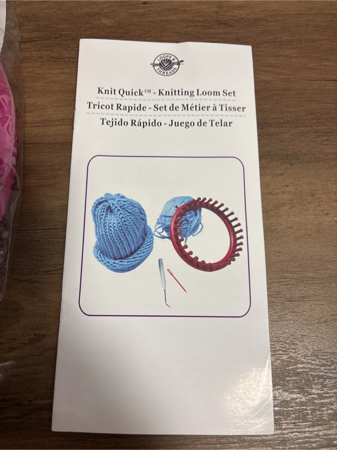 This is the Loops & Threads Knit Quick Knitting Loom Set. It includes 4 looms in various sizes: 5.5 in, 7.5 in, 9.5 in, and 11.3 in. Knitting hook is also included.