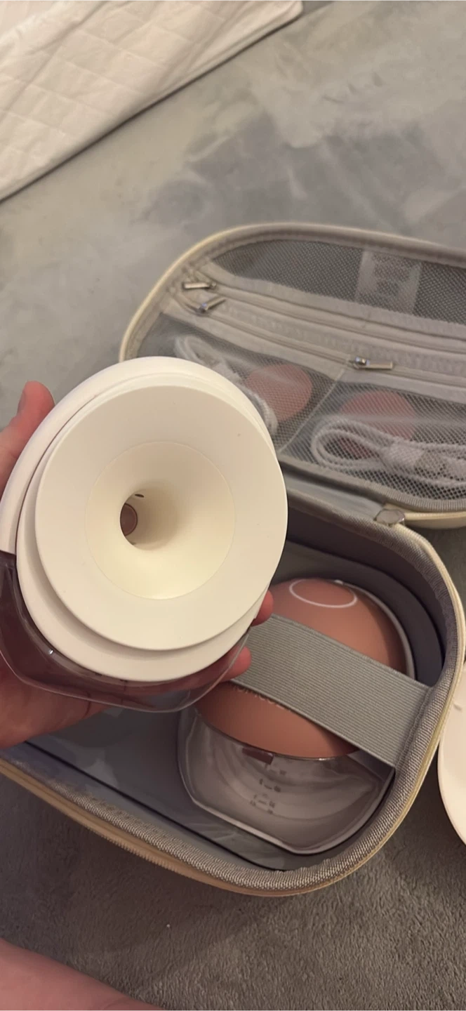 This Momcozy wearable breast pump kit comes in a convenient carrying case. It includes two breast pumps and charging cables. They are designed for discreet use.
