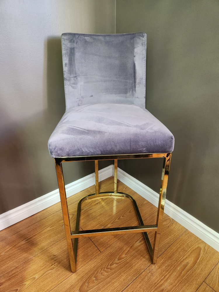 Only 1 available. Stylish bar stool. Grey velvet cushioned seat and backrest. Gold metal frame. Modern design. Perfect for kitchen island or bar.