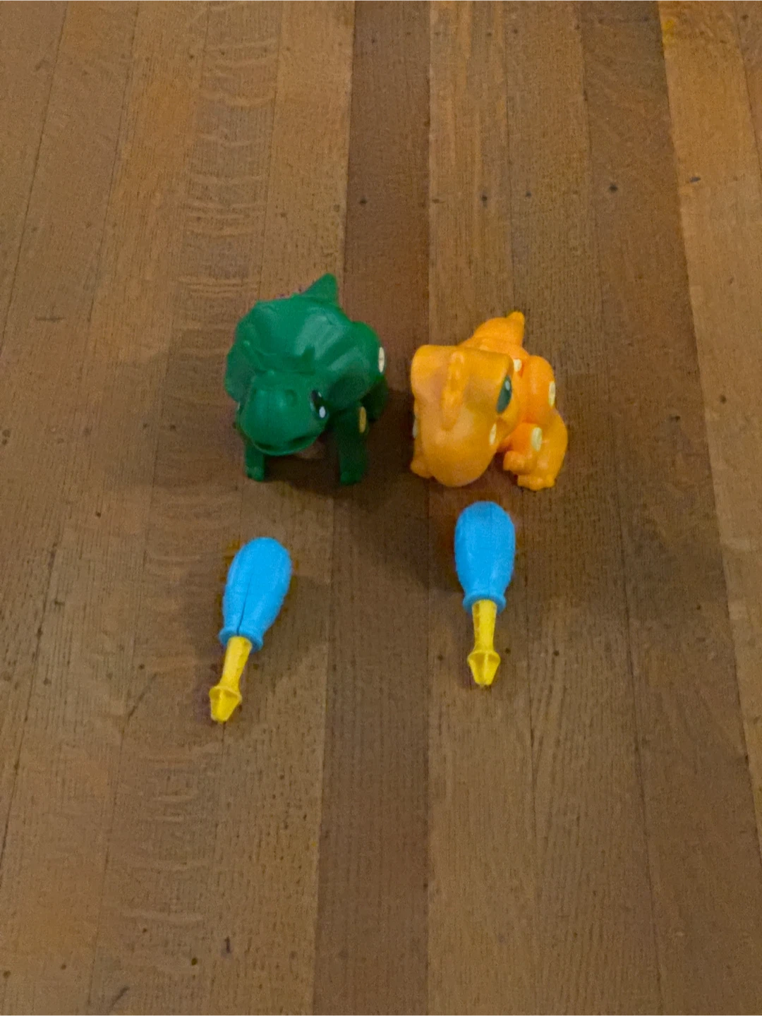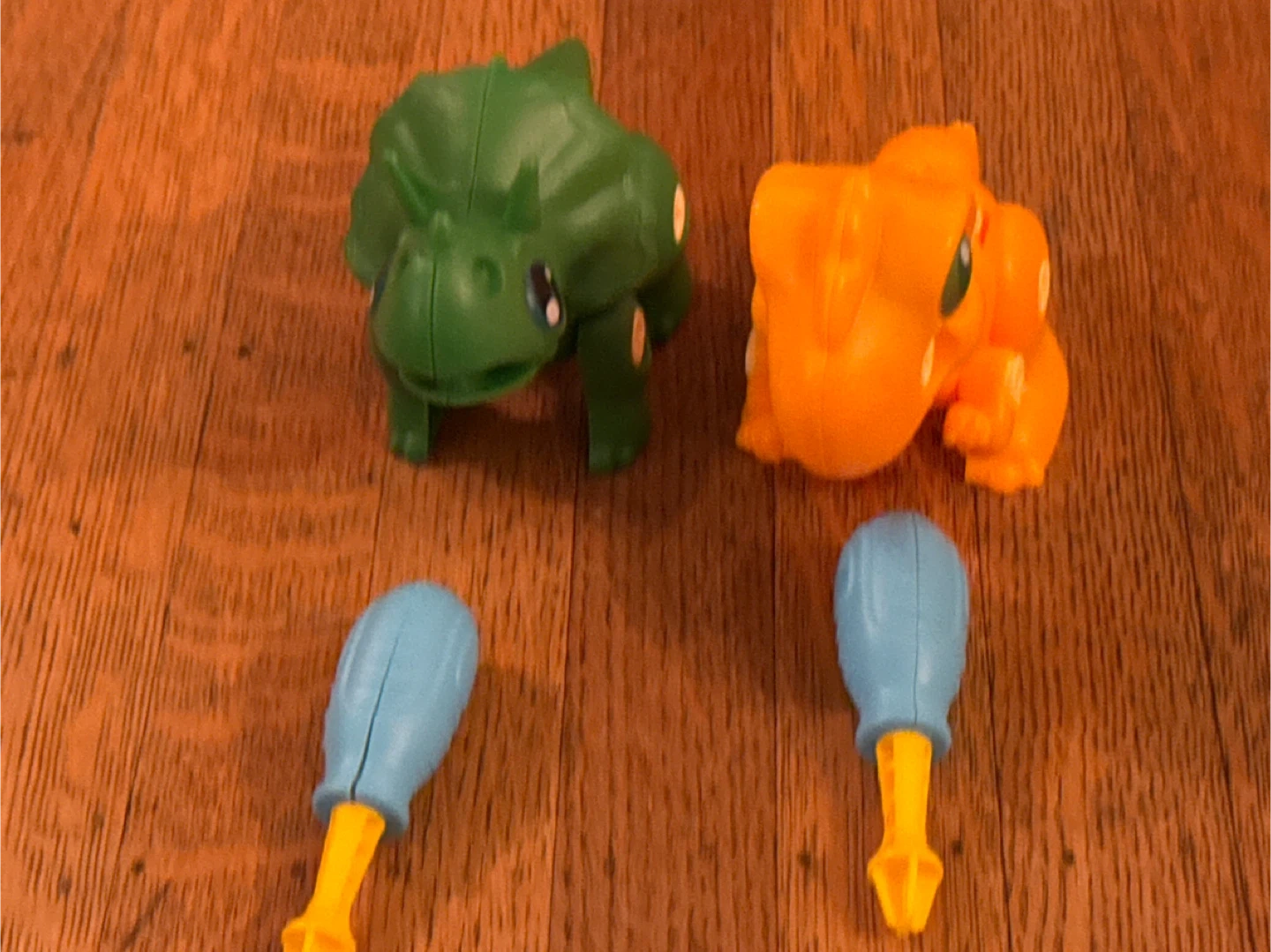 Selling a set of dinosaur squeeze toys, one green and one orange. Comes with two blue screwdrivers. Combo pack great for kids!