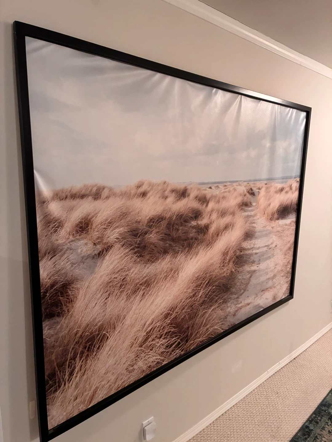 This is a large framed print featuring a serene landscape of beach grass dunes with a sandy path. It's matted with a black frame for a modern look. This piece adds a touch of nature's tranquility to any room.