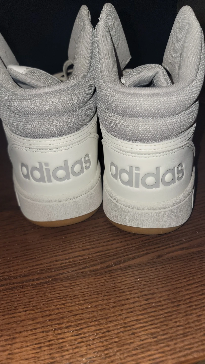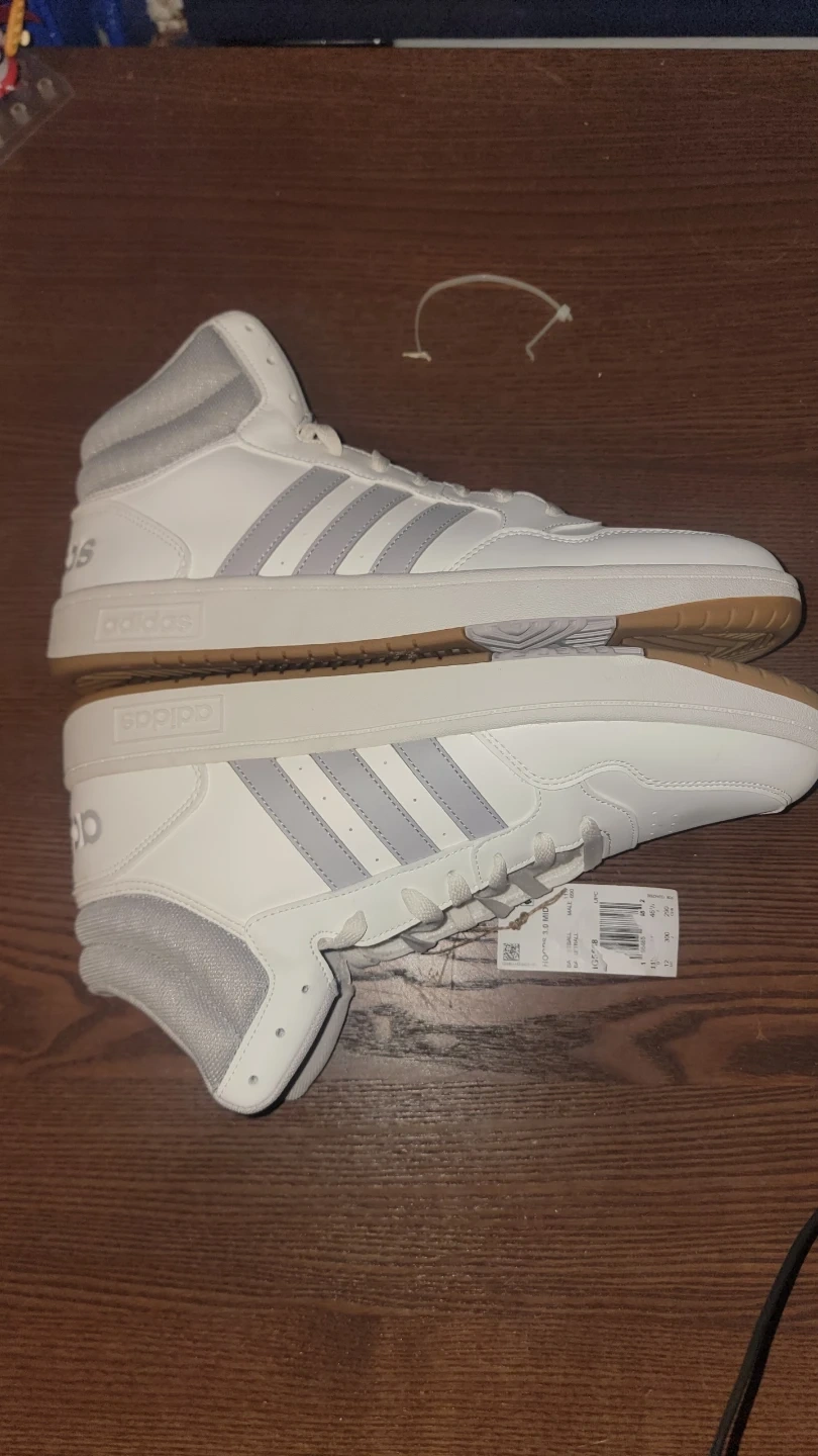 Selling a pair of brand new Adidas Hoops Mid sneakers! They are a stylish high top design in a clean white and gray colorway. The size is a US men's 12. These sneakers are ready for a new owner!