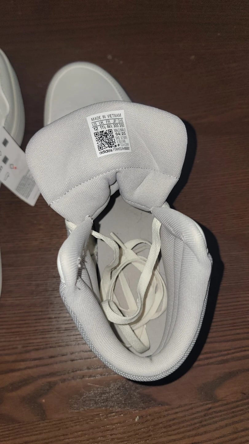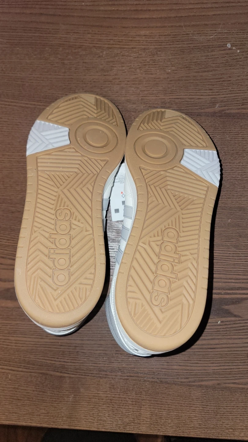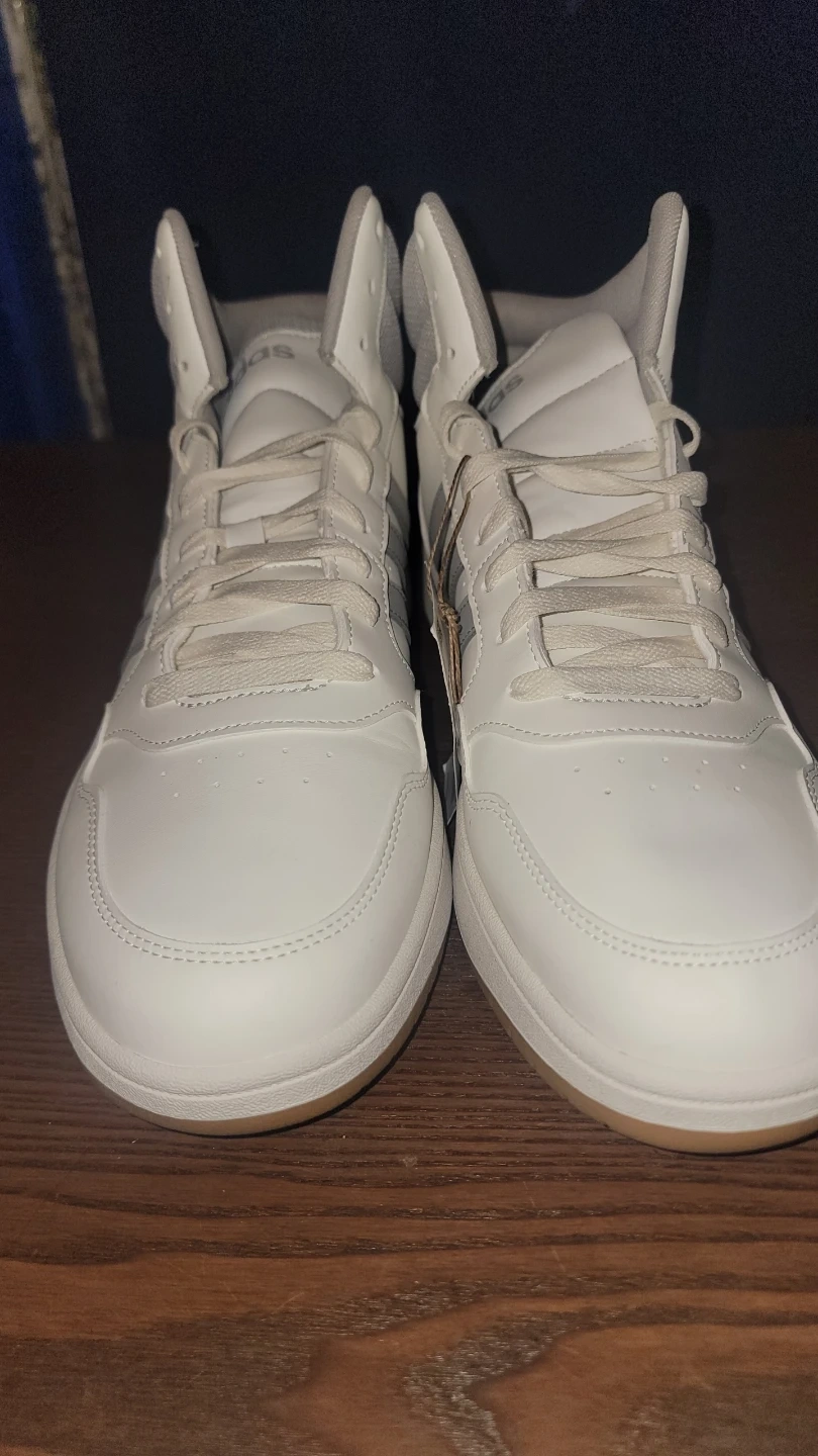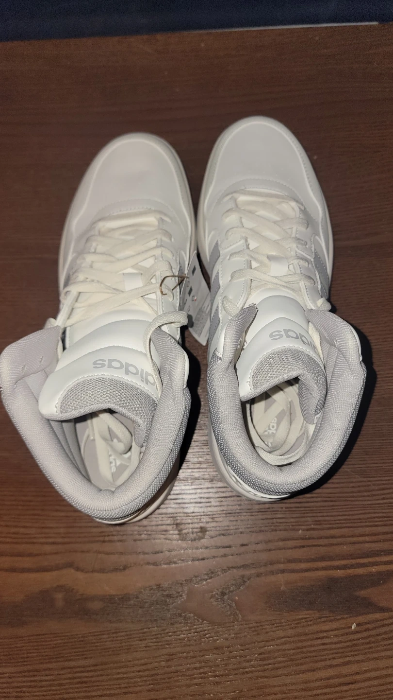 Selling a pair of brand new Adidas Hoops Mid sneakers! They are a stylish high top design in a clean white and gray colorway. The size is a US men's 12. These sneakers are ready for a new owner!