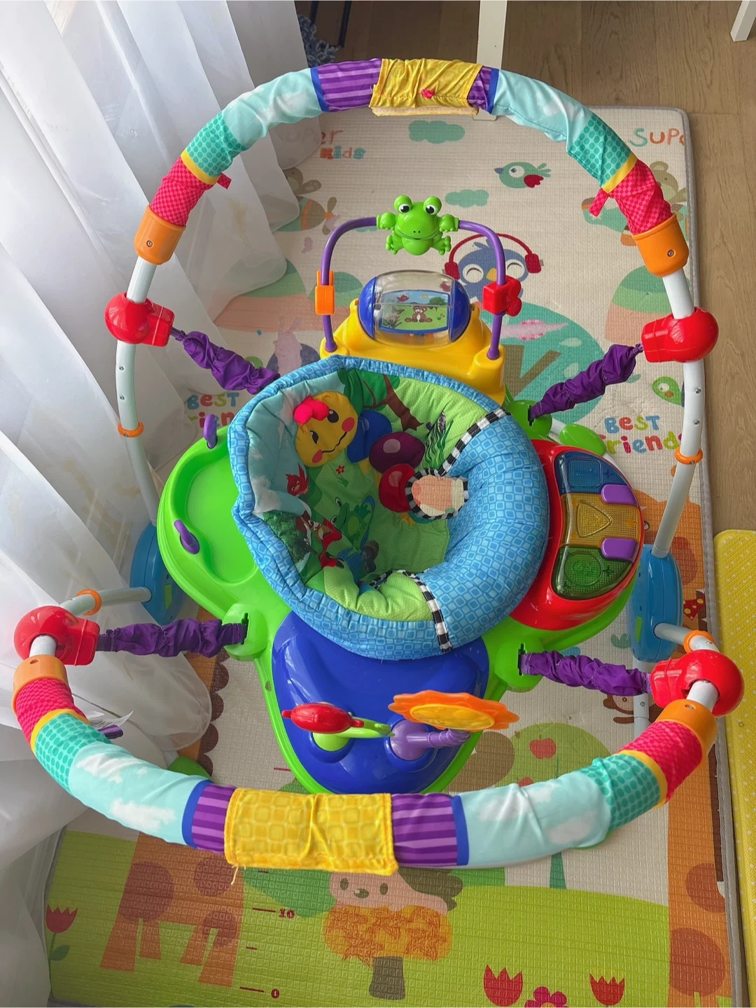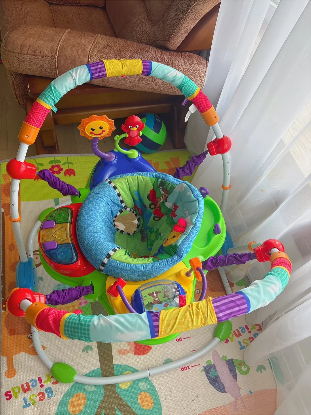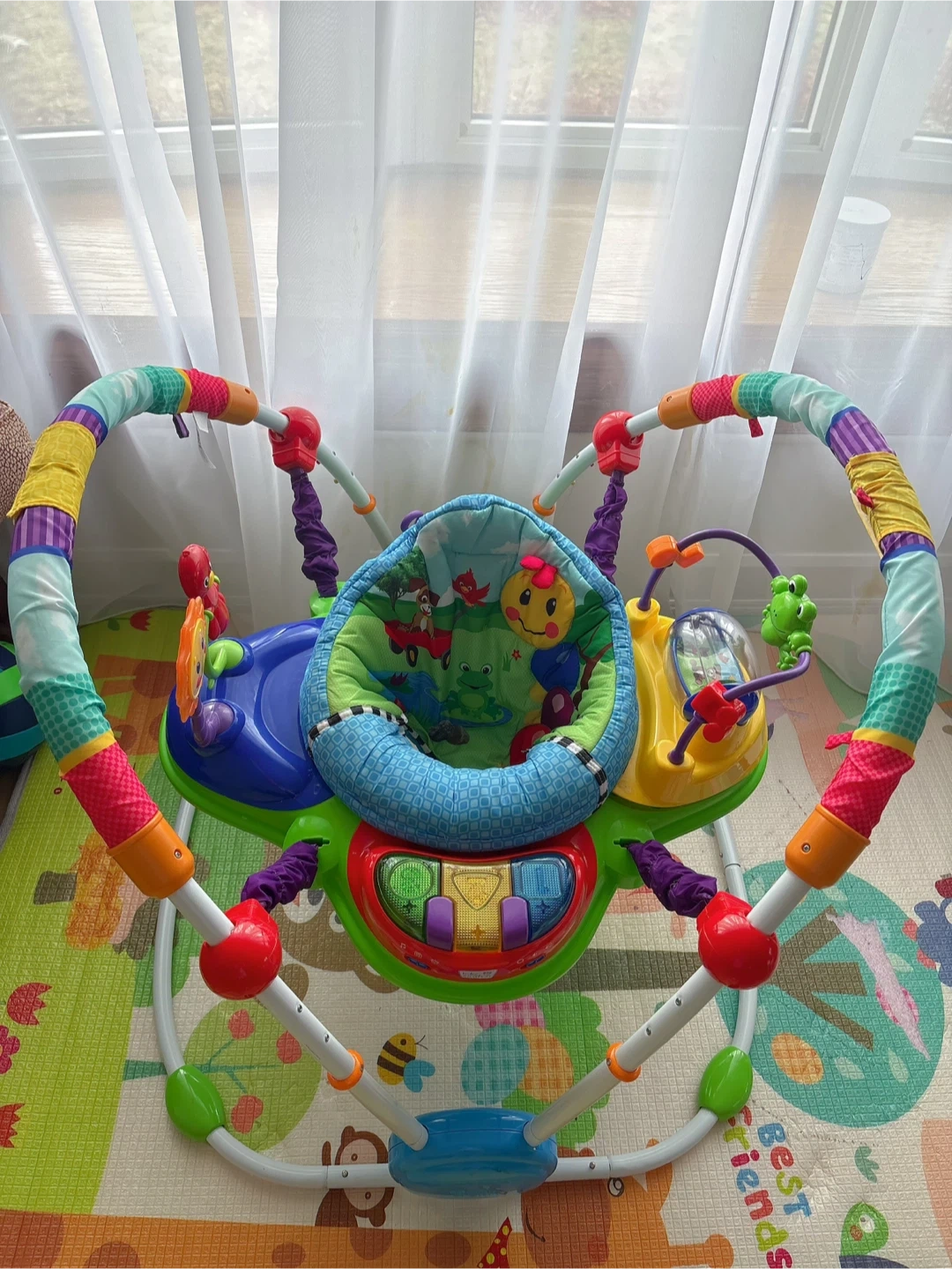This Baby Einstein Neighborhood Friends Activity Jumper provides entertainment and exploration for your little one. It features multiple activity stations, including a light-up piano and spinning toys. The jumper is designed for babies to bounce and play safely for above 4 months old - they may not use it anymore after 1.5 year old but before that they’ll have lots of fun for your kids who love jumping.
