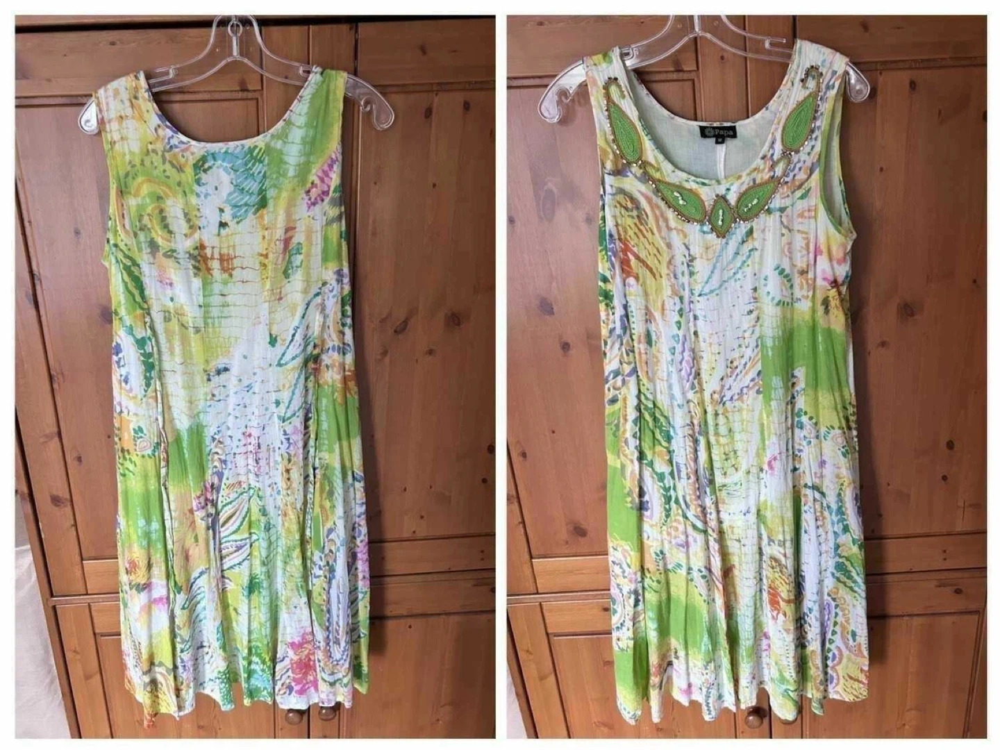 This colourful sleeveless dress from features a vibrant print and a unique embellished neckline. It's a breezy option for fun days. The dress has a U-neck and a knee-length cut.