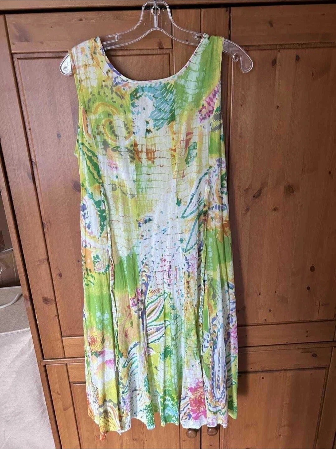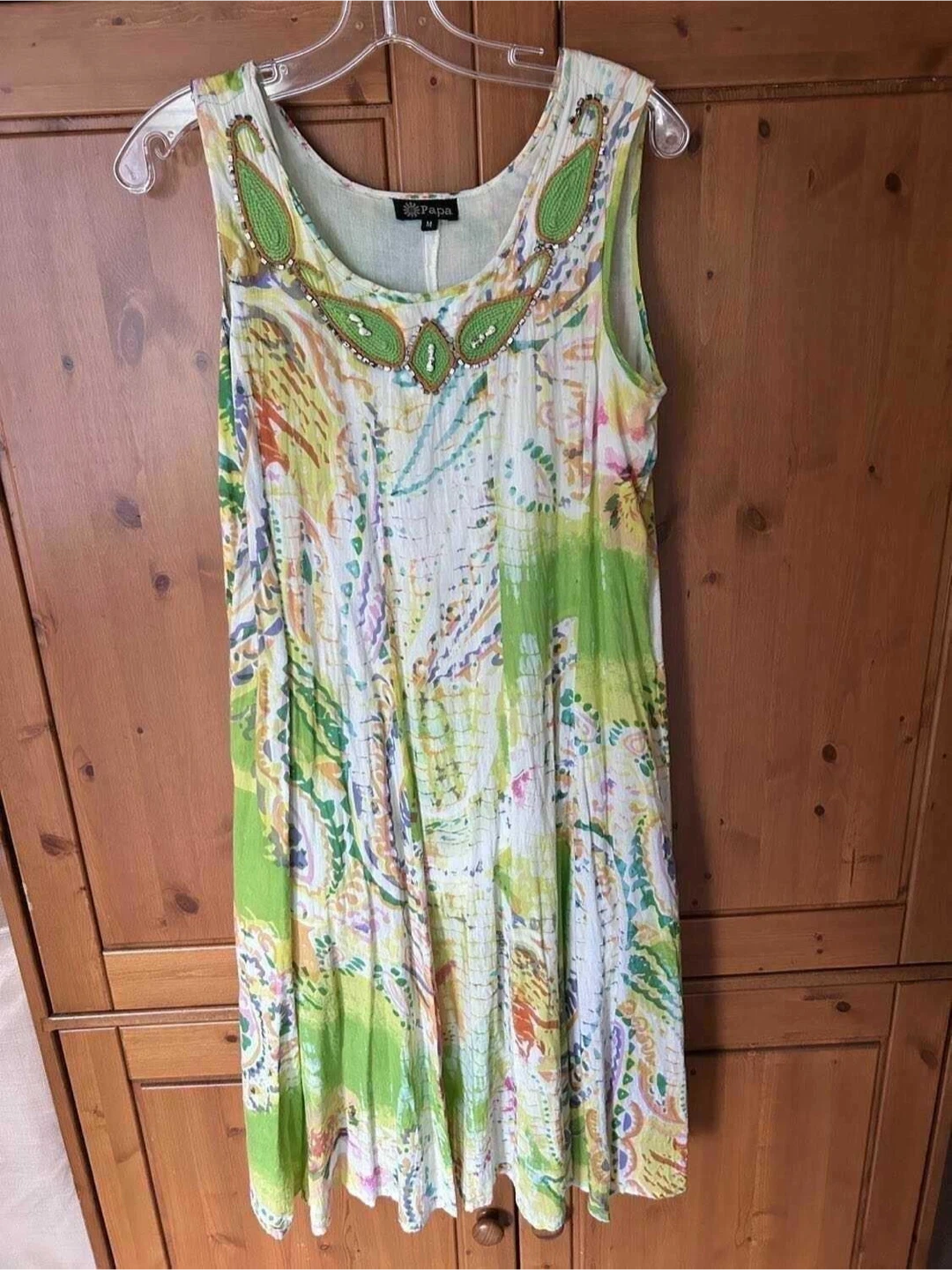 This colourful sleeveless dress from features a vibrant print and a unique embellished neckline. It's a breezy option for fun days. The dress has a U-neck and a knee-length cut.