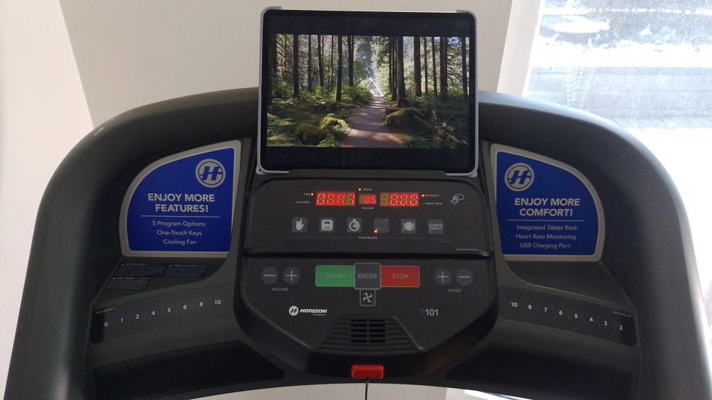 Looking for a high-quality treadmill to stay active at home? This Horizon T101 is the perfect choice! It's a sturdy, smooth, and quiet treadmill, ideal for walking, jogging, and running.