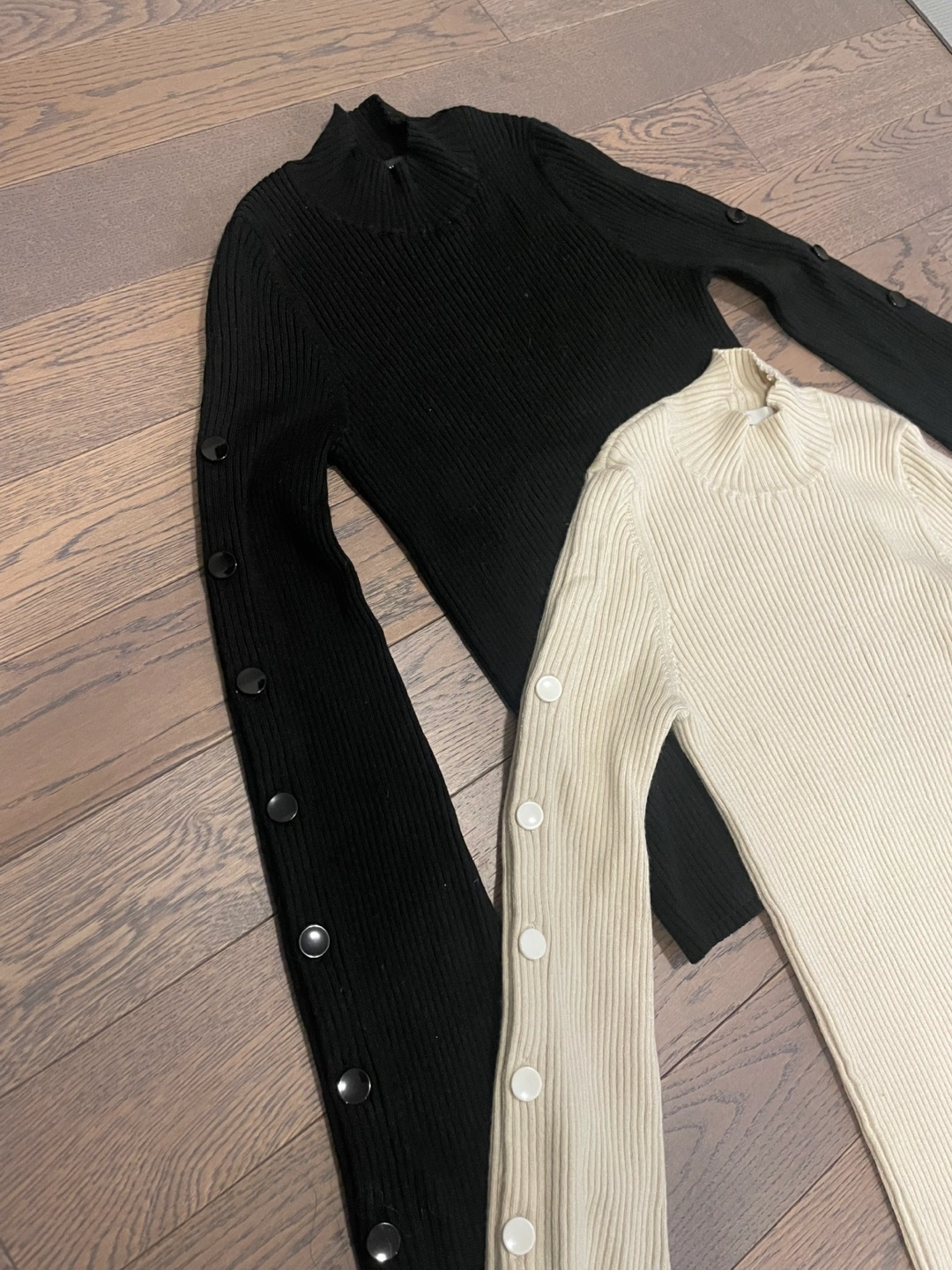 Two long-sleeved tops, one in black and one in cream. Both feature a mock neck and ribbed knit material. Sleeves have a flare design with button accents. Great for layering or wearing on their own!