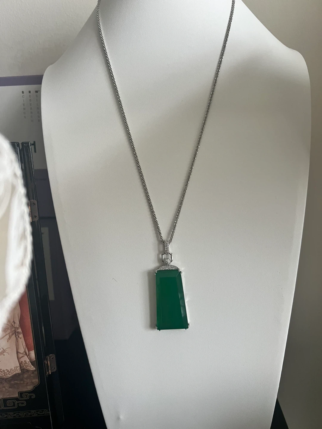 This necklace features a delicate silver chain and a striking green stone pendant. It's designed with a modern rectangular cut and clear accents on the bail. A lovely addition for any jewellery collection!
