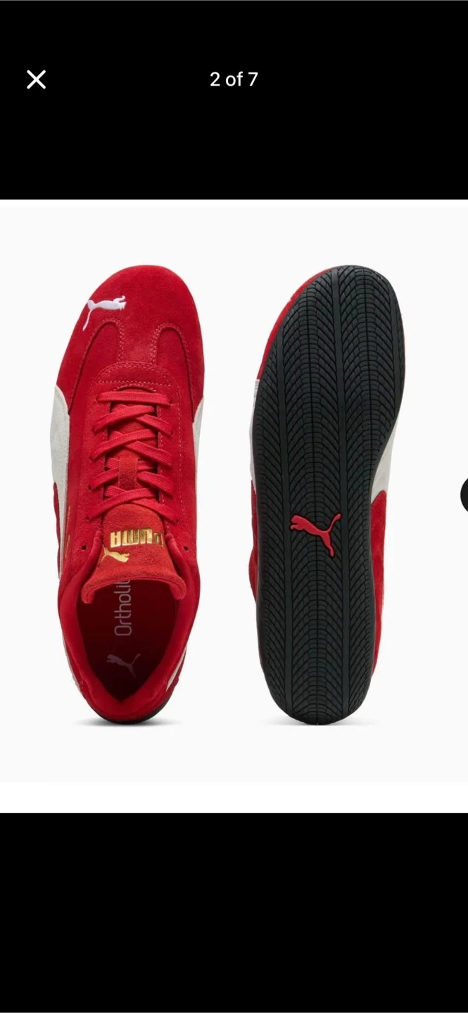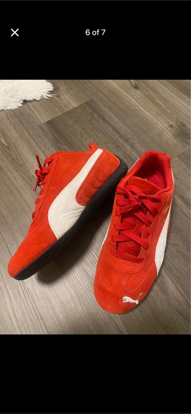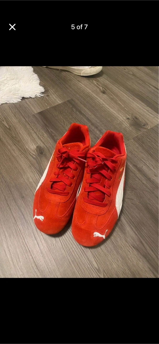 These red Puma sneakers are made with a suede upper and feature the classic Puma formstrip. They have a lace-up closure for a secure fit. The rubber sole provides good traction.
