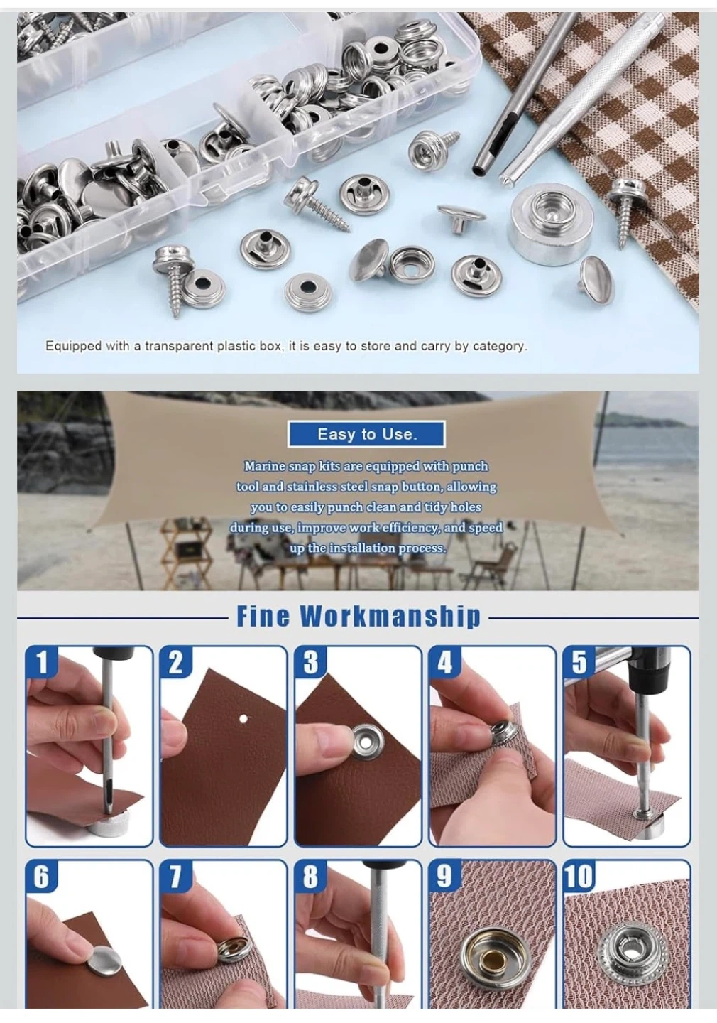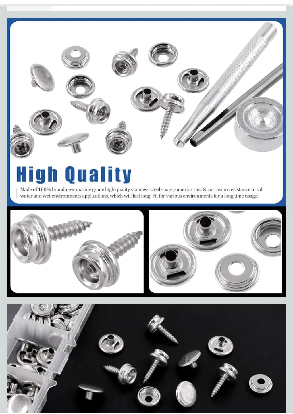 Includes a variety of marine grade stainless steel snap fasteners for canvas, tarps, tents, and clothing. These are rust and corrosion resistant, ideal for salt water and wet environments. The set comes with a handy punch tool for easy installation. Perfect for outdoor and DIY projects!