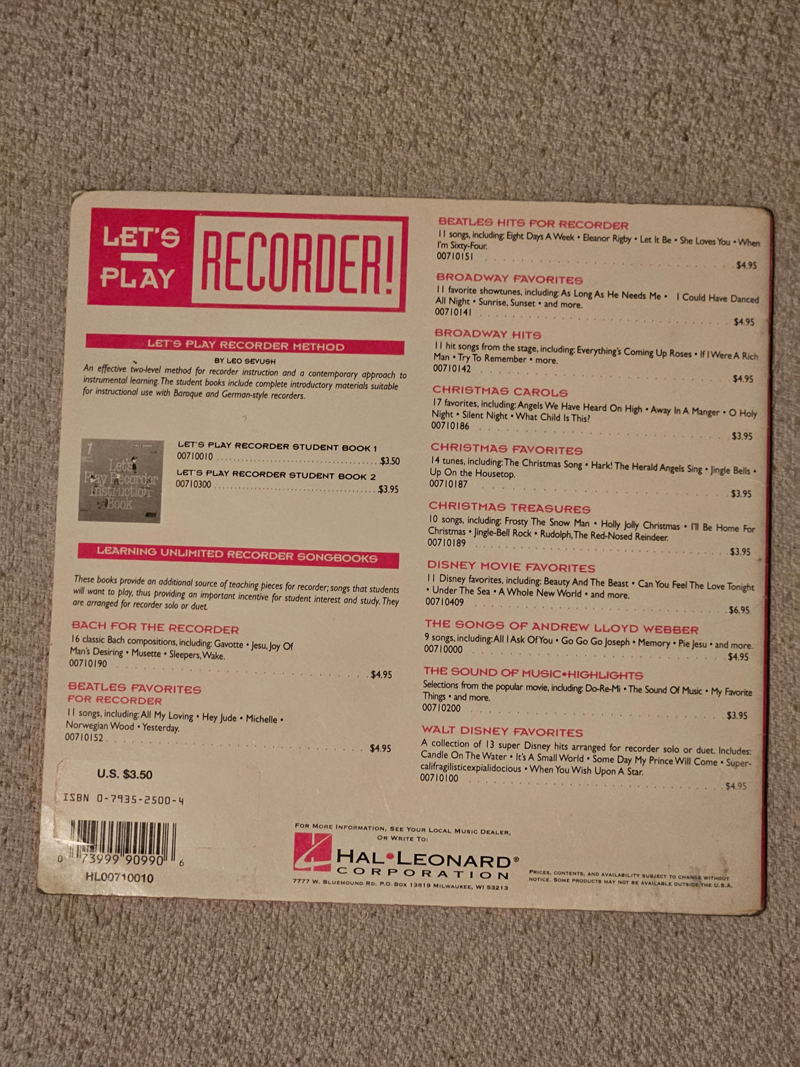 I'm selling an instruction book called "Let's Play Recorder Instruction Book" by Leo Sevush from Learning Unlimited. It's an effective two-level method for recorder instruction and a contemporary approach for instructional use. The student books include complete introductory materials suitable for instructional use and baroque and contemporary style recorders.