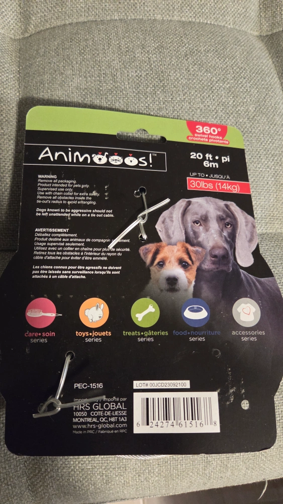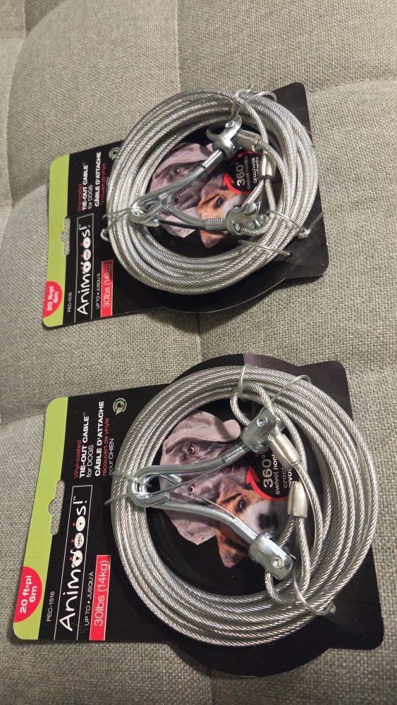 I'm selling 2 brand new vinyl-coated tie-out cable for dogs. It's 20 ft long and suitable for dogs up to 30 lbs (14kg). It also features 360° swivel hooks.