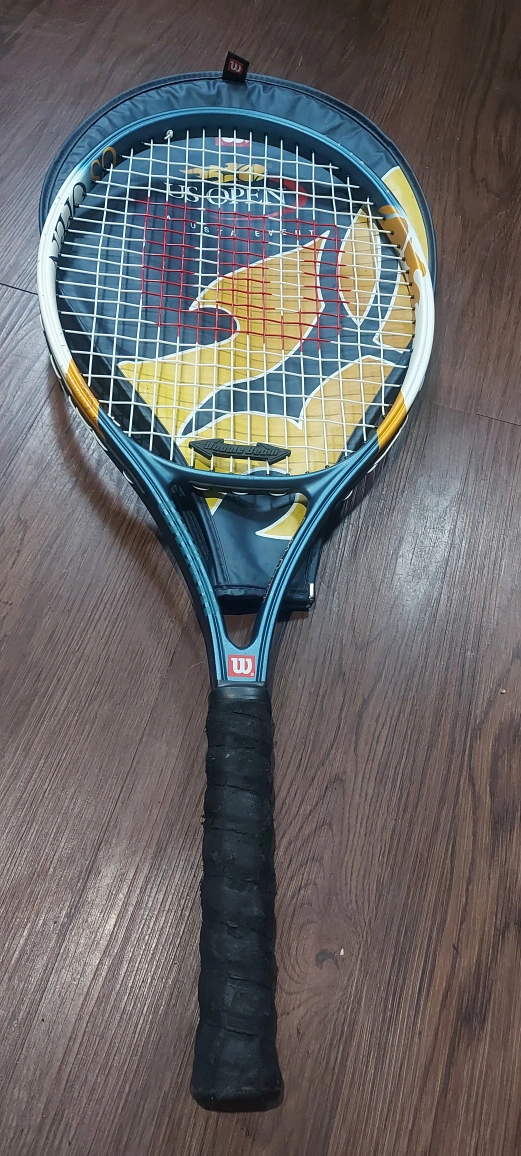 Selling a Wilson US Open tennis racquet. It comes with its original case. The grip is worn, as shown in the photos, but the racquet itself is in good condition!