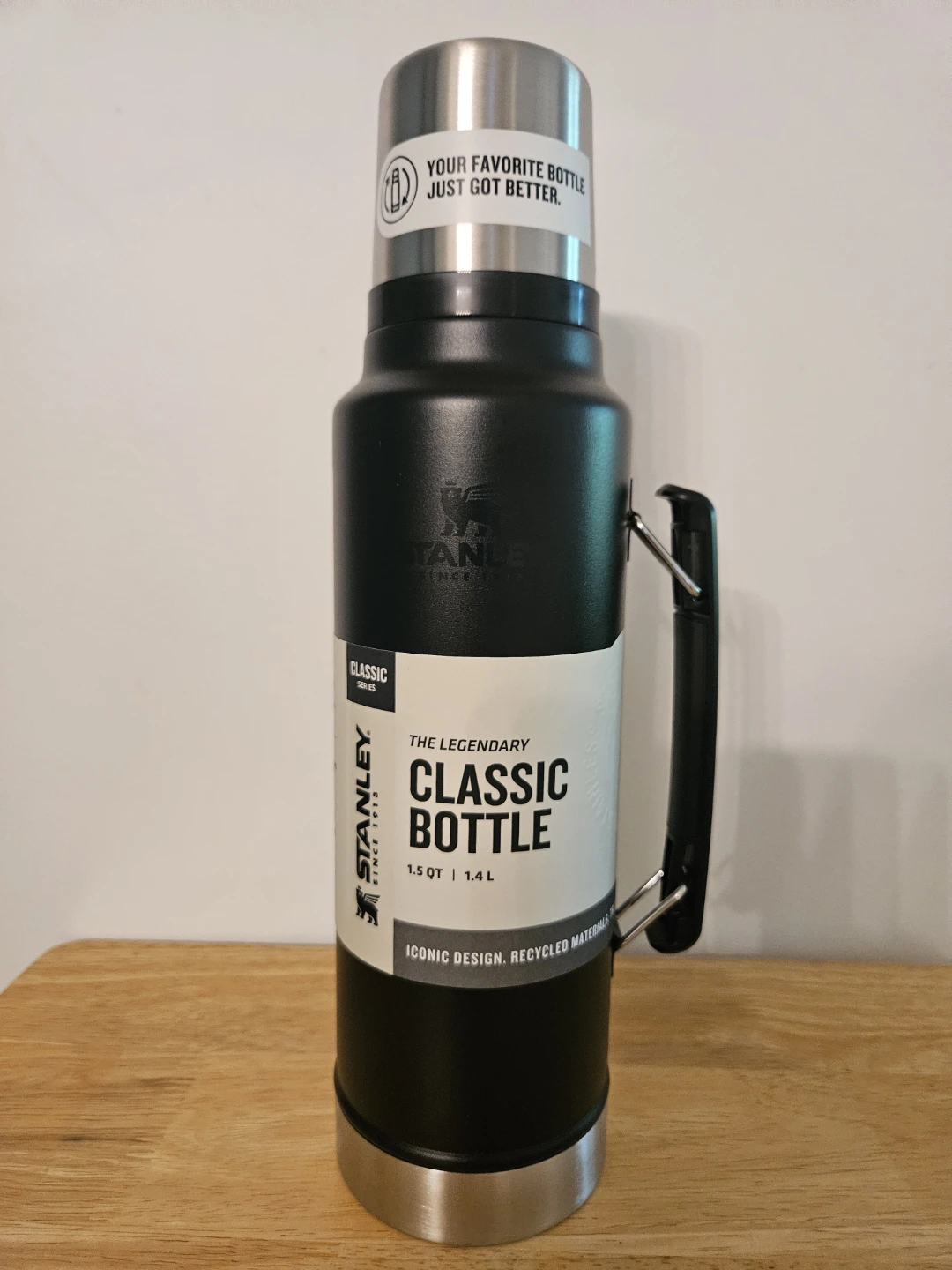 This is a Stanley Classic Bottle, 1.5 QT size! It keeps drinks hot for up to 38 hours, cold for 35 hours, and iced for up to 6 days. It's black and in great shape!