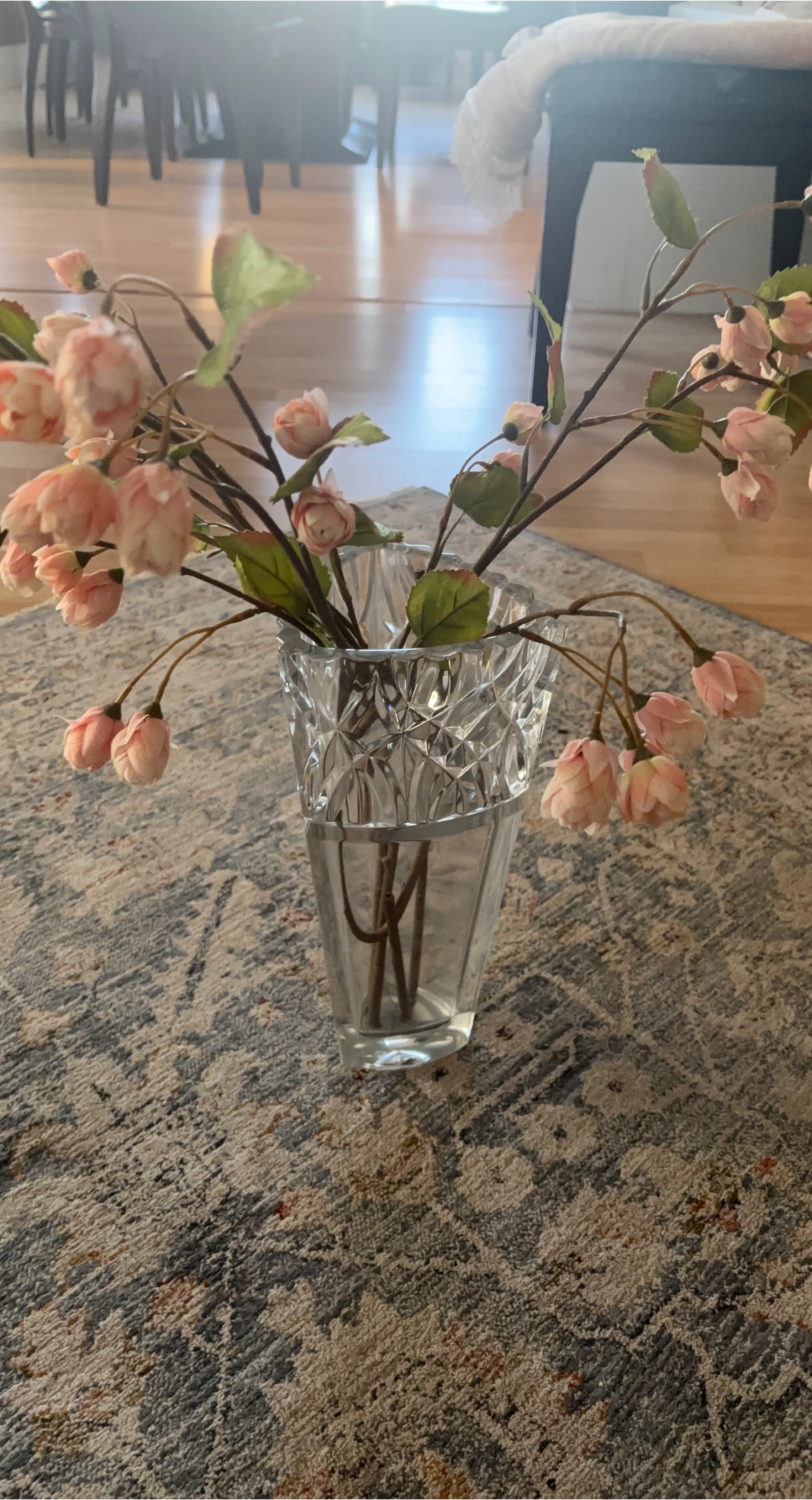 Decorative glass vase with delicate pink artificial flowers. It features a classic cut glass design and comes with faux floral branches. This piece adds a touch of elegance to any room. It’s pretty heavy for a vase, it’s likely worth more but I’m listing it for a fair price.
