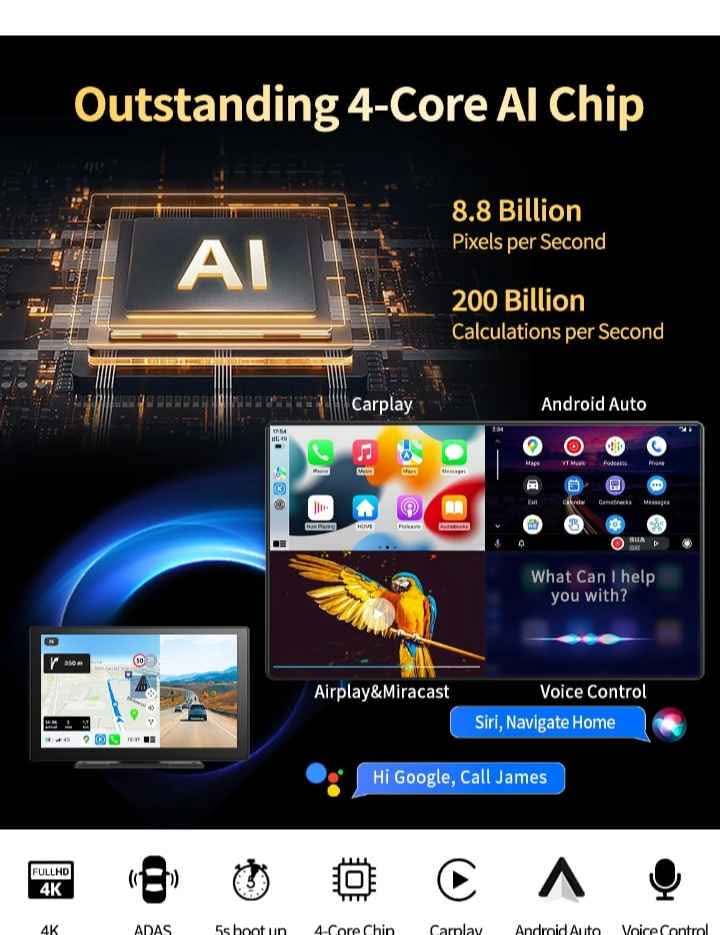 9-inch Portable Apple CarPlay Car Screen, Wireless Android Auto, 4K Dash Cam and 1080P Backup Camera, ADAS Assistance System, GPS Navigation, Mirror Link.