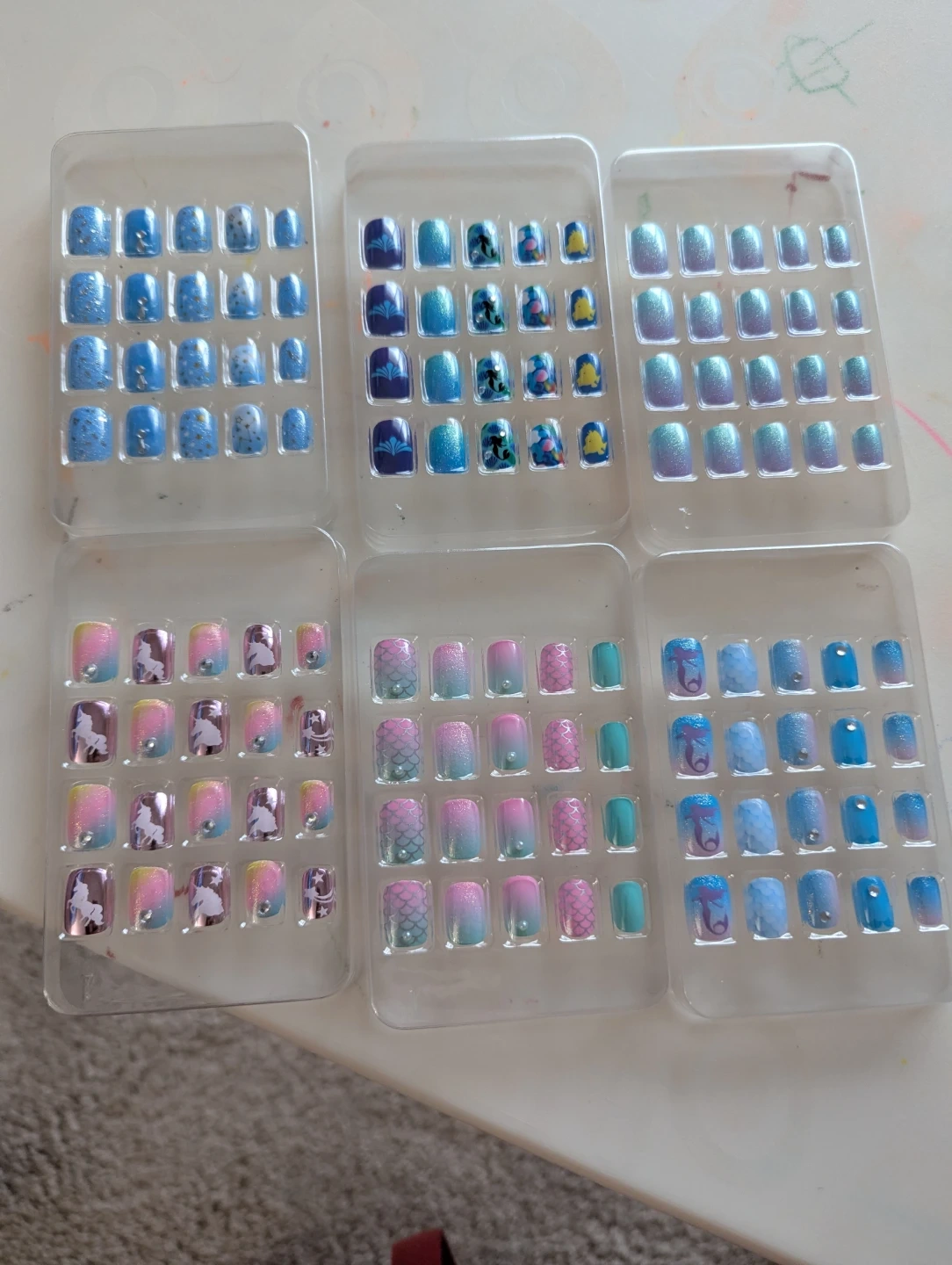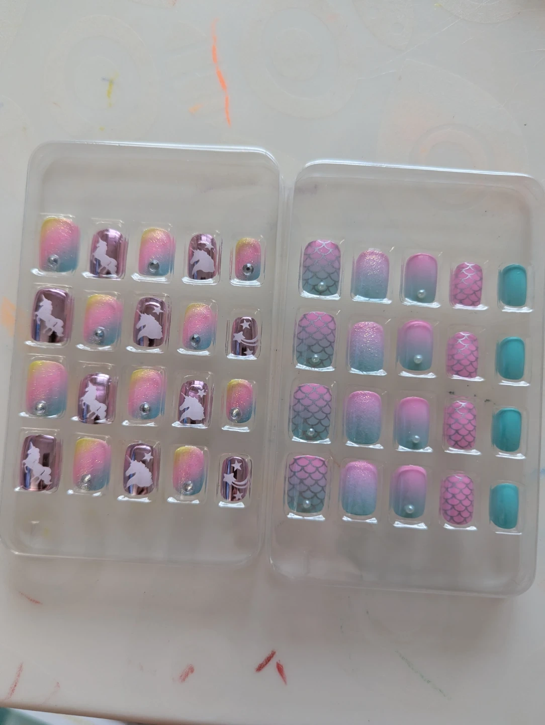 Press-on nails in 12 junior sizes for children. They feature vivid colours and delicate patterns, including unicorns, rainbows, and mermaid scales. They're designed for easy application with included jelly gel adhesive.