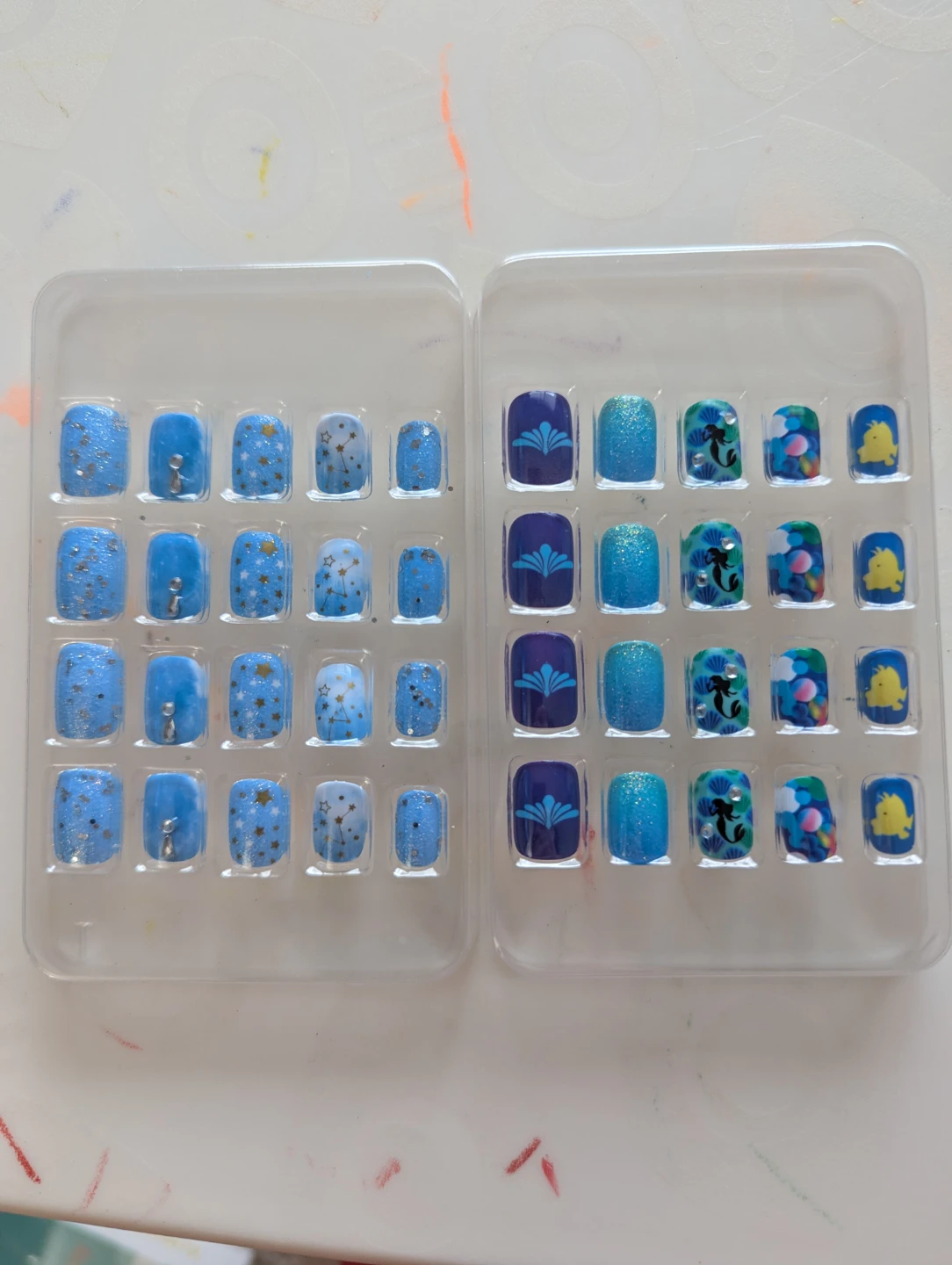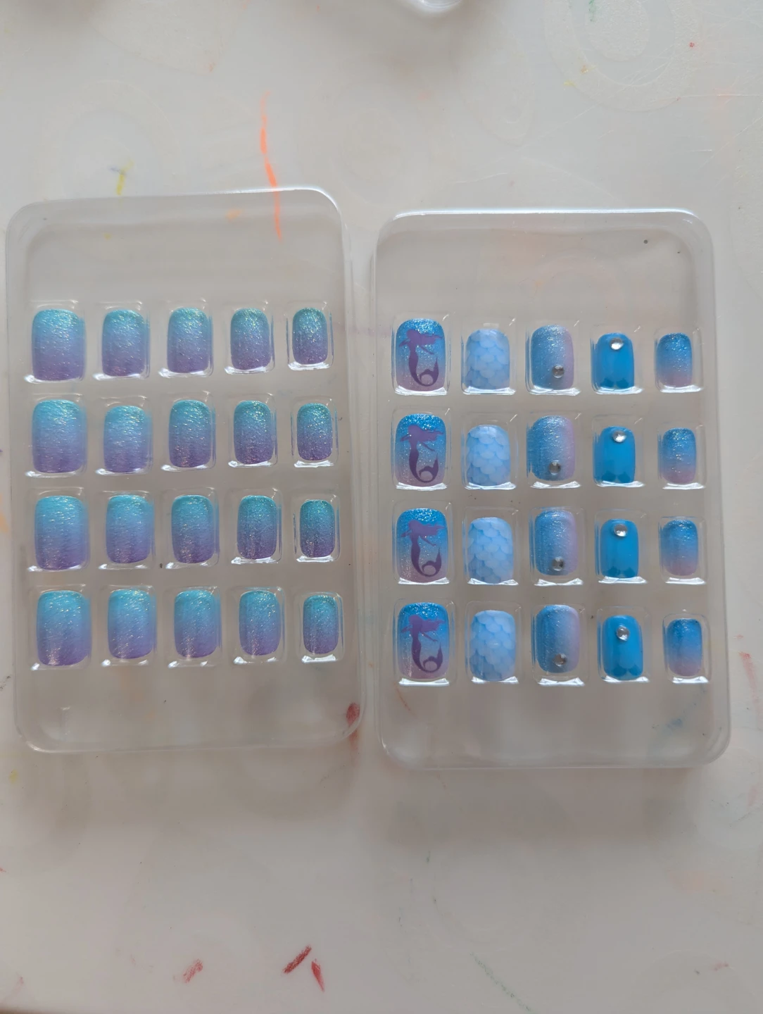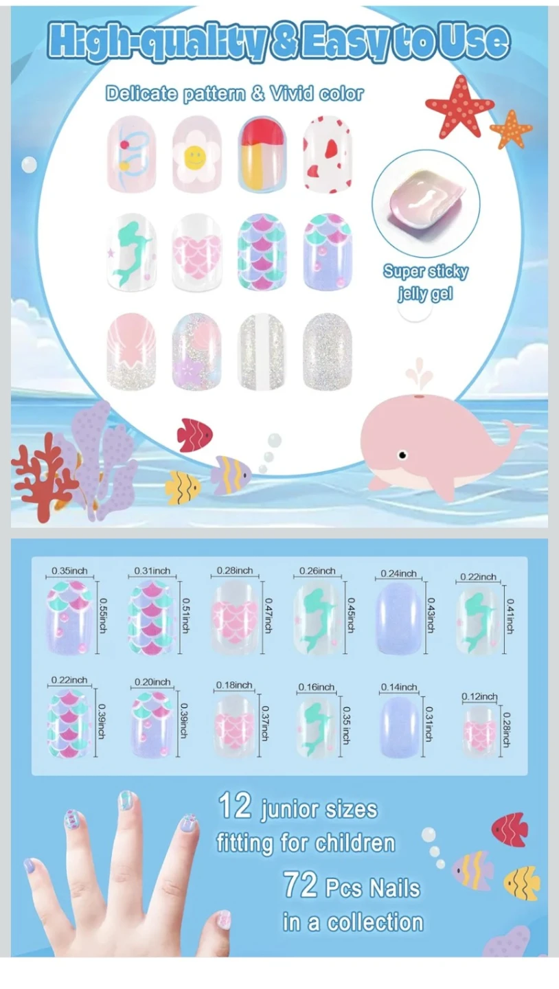Press-on nails in 12 junior sizes for children. They feature vivid colours and delicate patterns, including unicorns, rainbows, and mermaid scales. They're designed for easy application with included jelly gel adhesive.