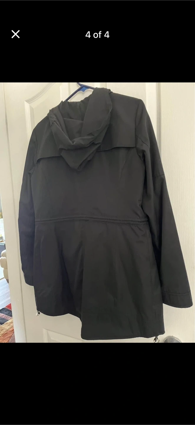 Black hooded Betsey Johnson rain coat. Size medium.