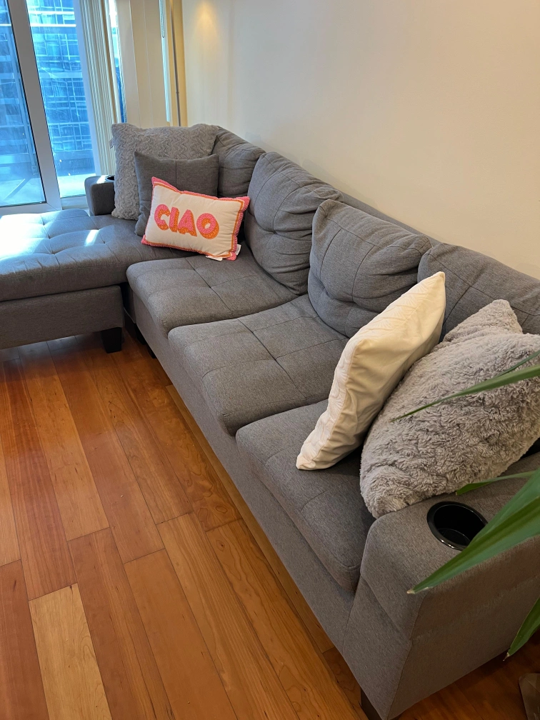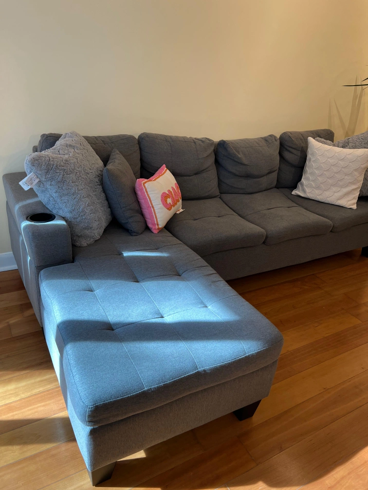 Grey sofa with a chaise lounge! It's in great condition and perfect for a living room or entertainment space. It features a cup holder on one side. Pillows are not included