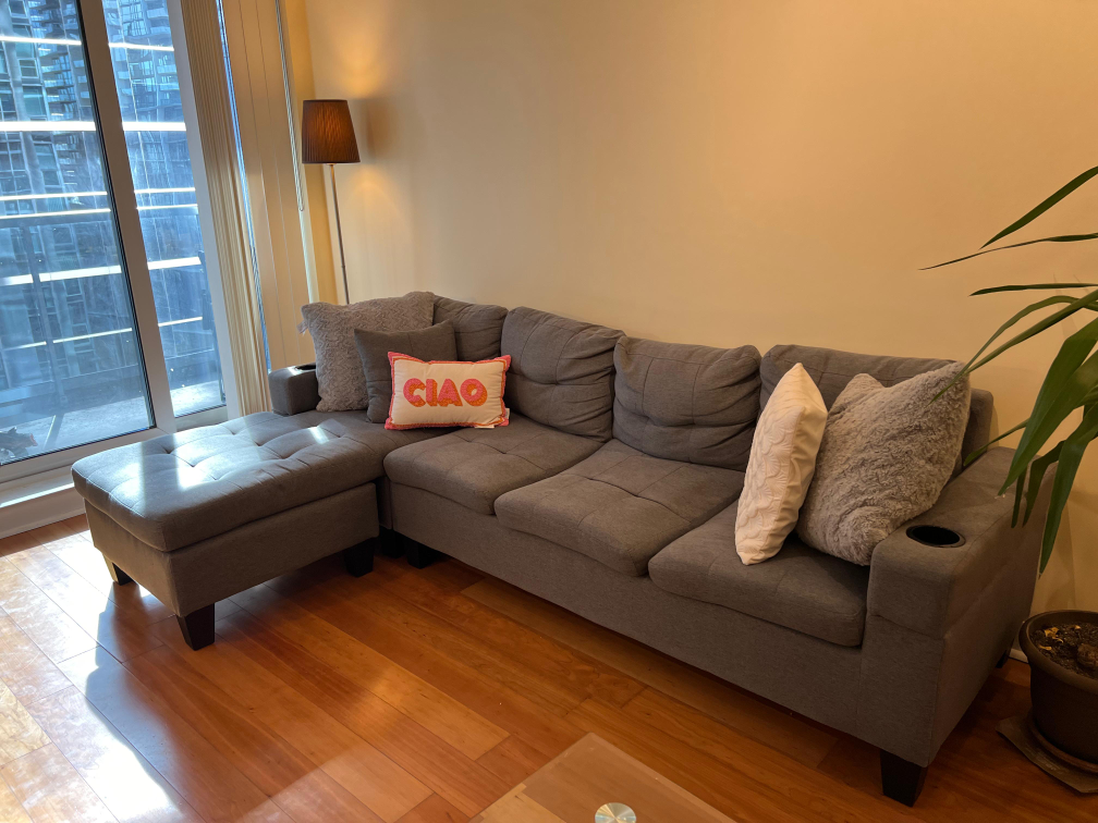 Grey sofa with a chaise lounge! It's in great condition and perfect for a living room or entertainment space. It features a cup holder on one side. Pillows are not included