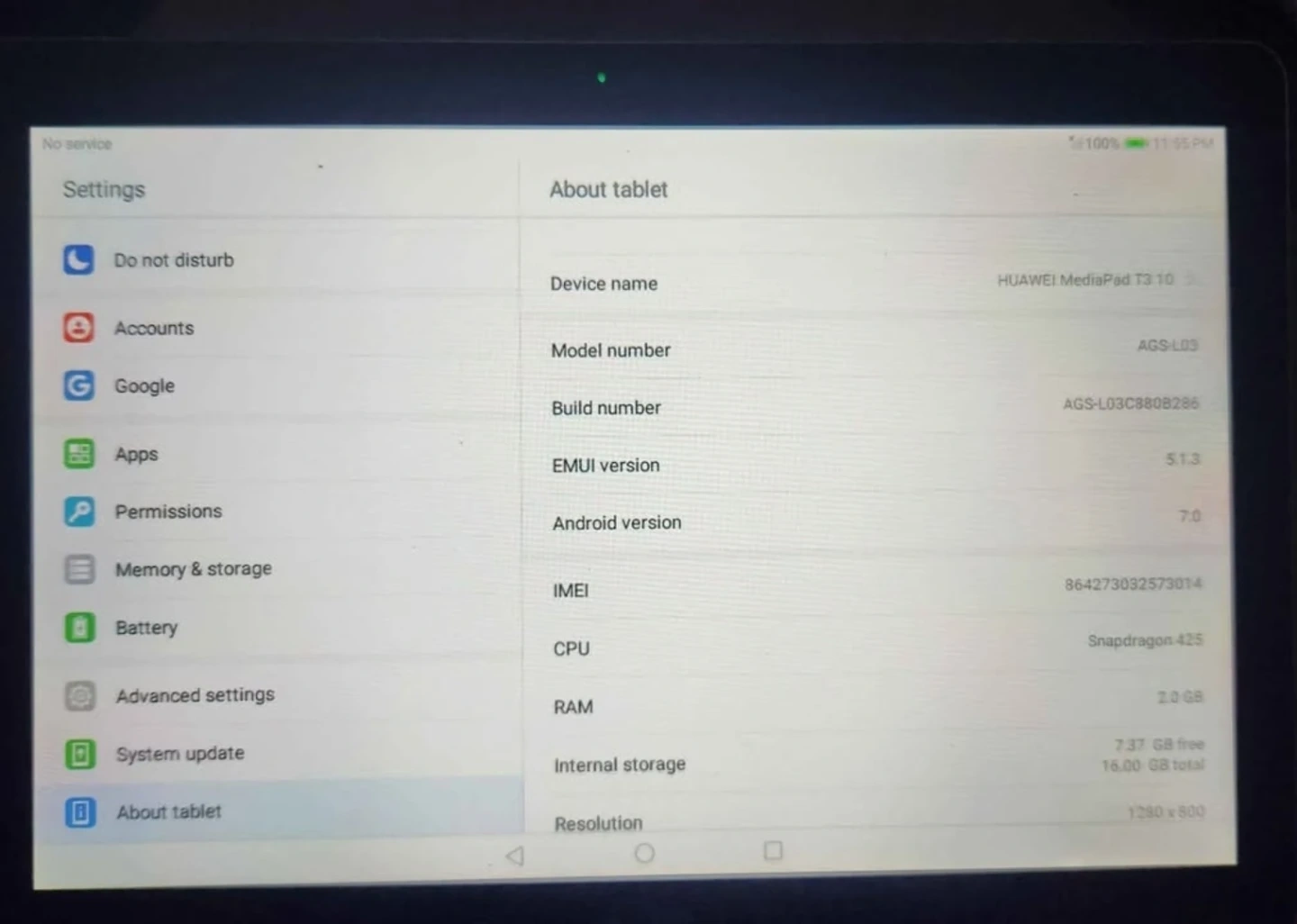 60Selling a HUAWEI MediaPad T3 10 tablet. It has a resolution of 1280x800 and 2.0 GB RAM. The internal storage is 16.00 GB total, with 7.37 GB free. Feel free to ask any questions!