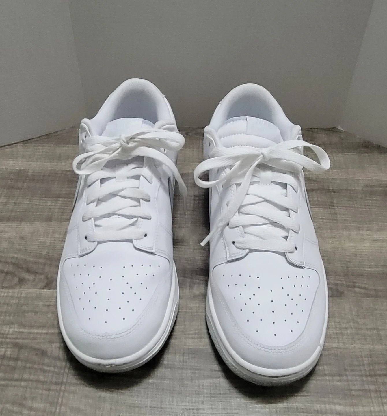 Nike Dunk Low sneakers in white. Men's size 11. Leather and synthetic materials.