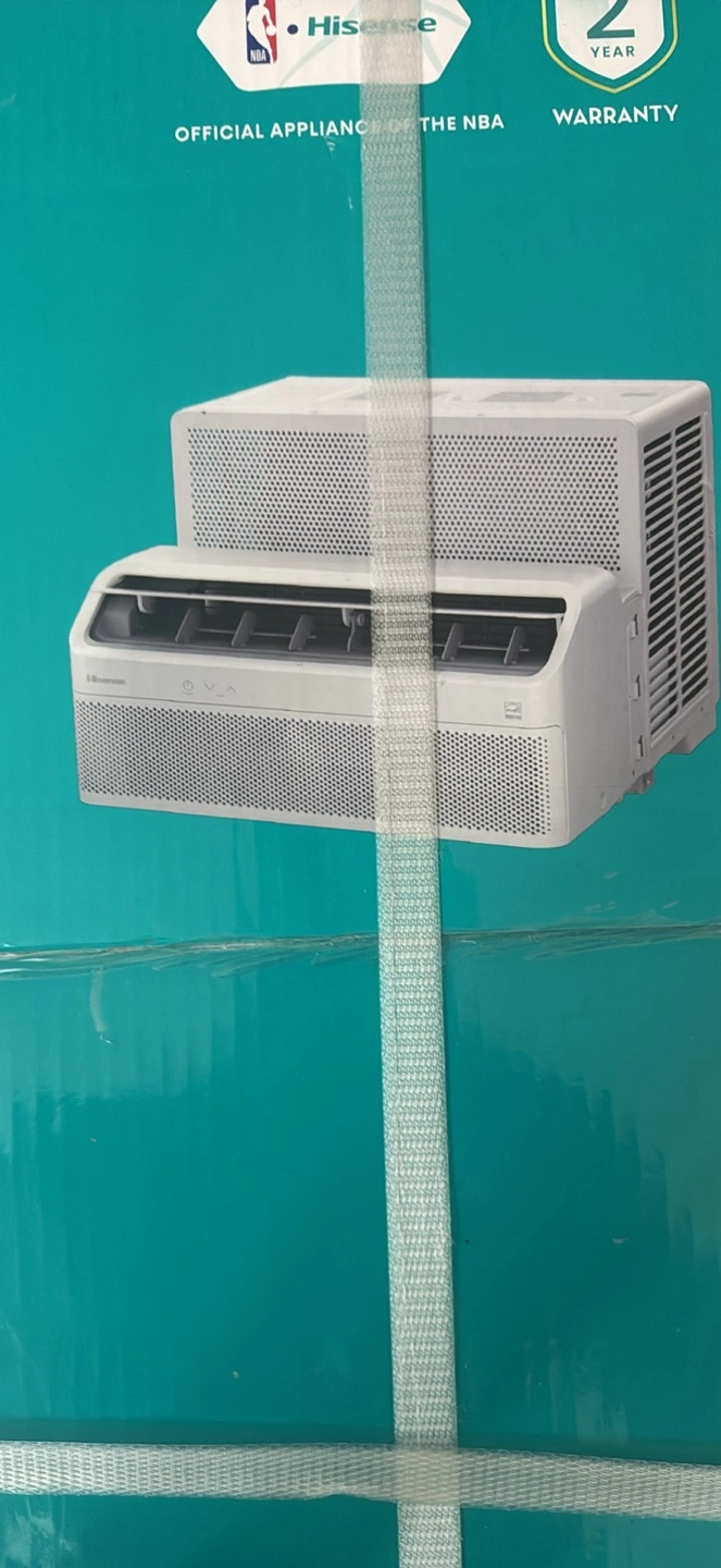 The box features the Hisense brand and product specifications. It is a window air conditioner unit with an ultra slim profile. It's perfect for cooling down your space on those hot summer days.