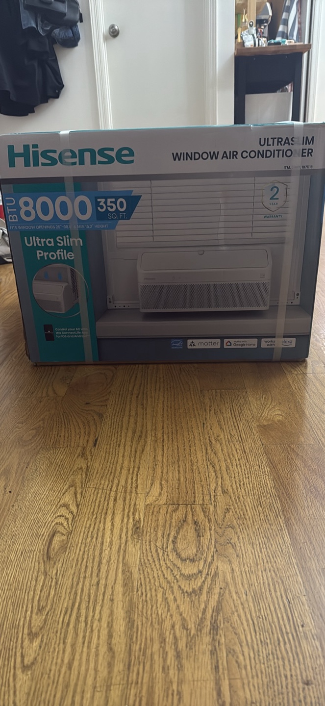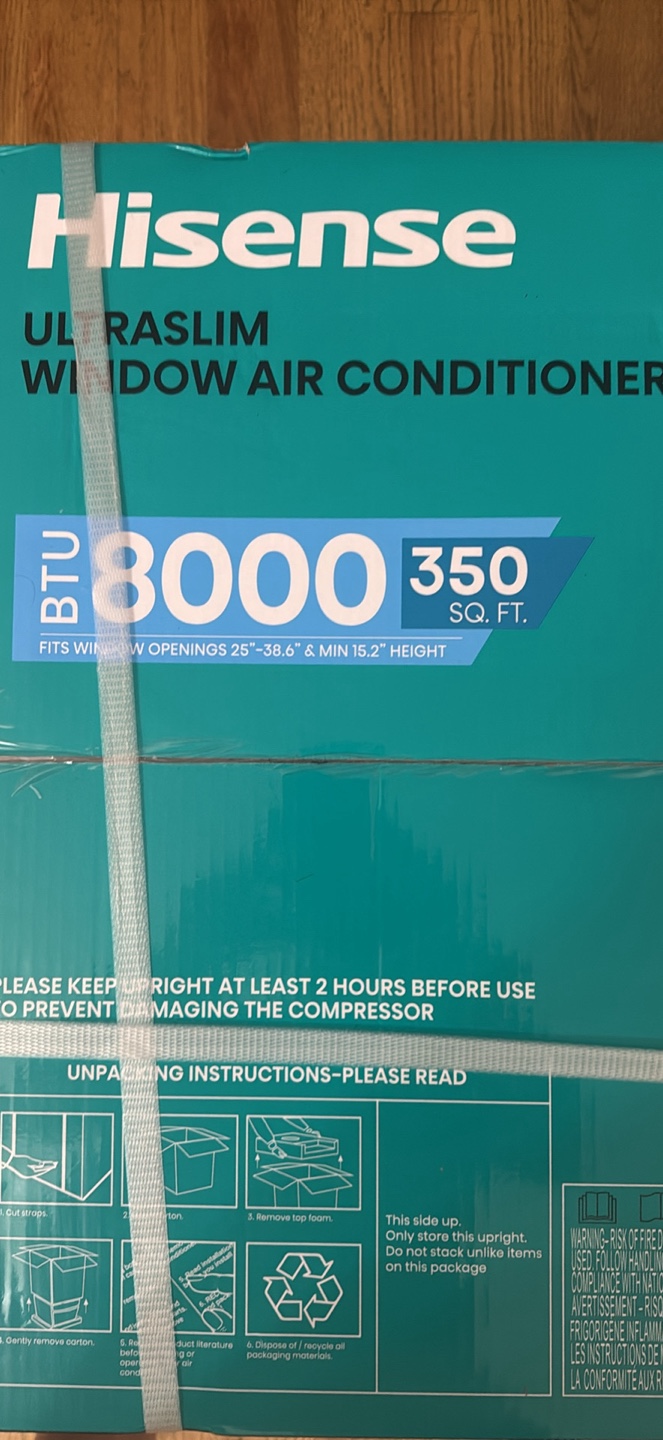 The box features the Hisense brand and product specifications. It is a window air conditioner unit with an ultra slim profile. It's perfect for cooling down your space on those hot summer days.