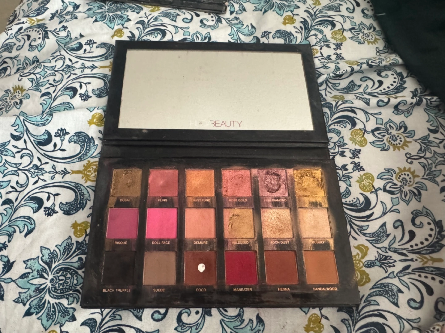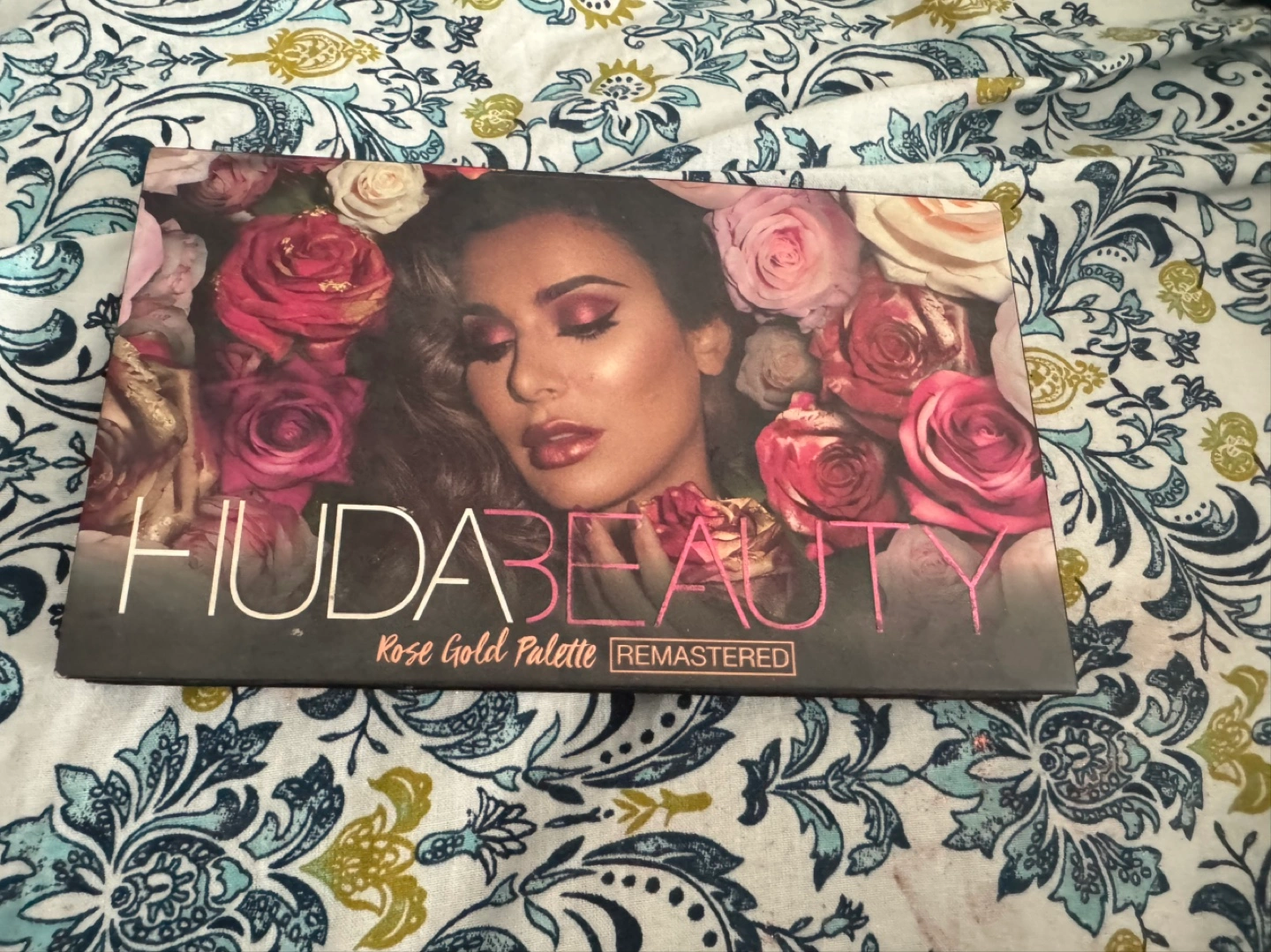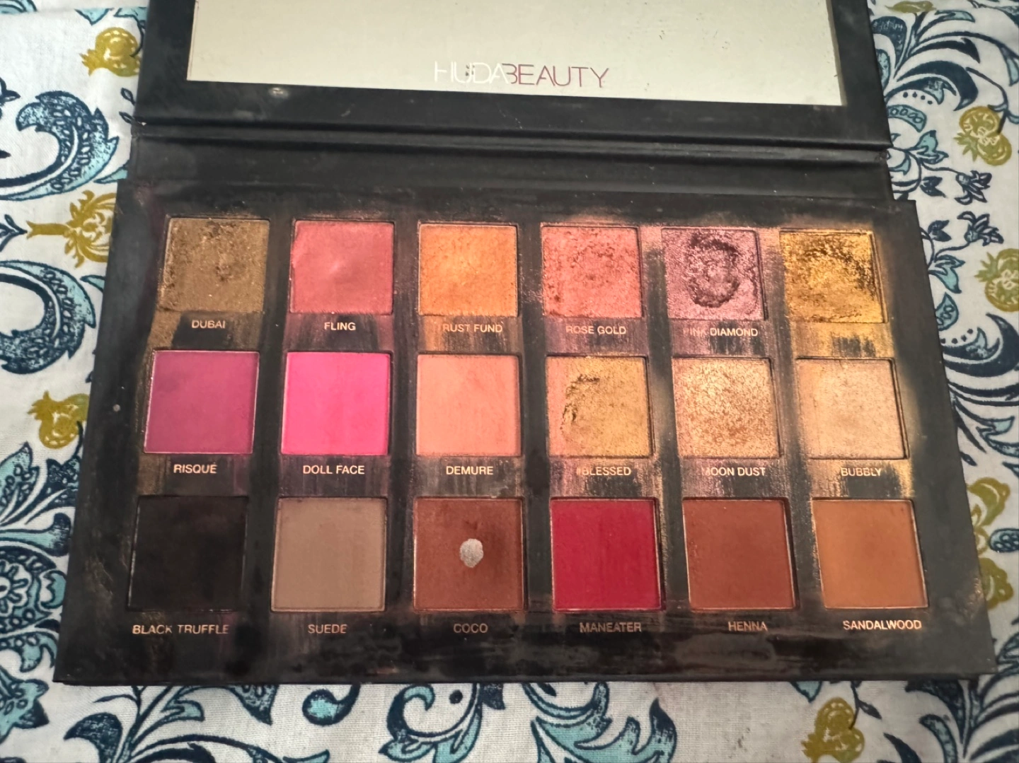 Used Huda Beauty Rose Gold Remastered eyeshadow palette. Several shades used, some pans significantly reduced. Includes mirror. Pre-owned, some wear.