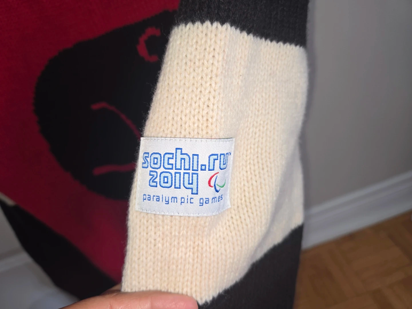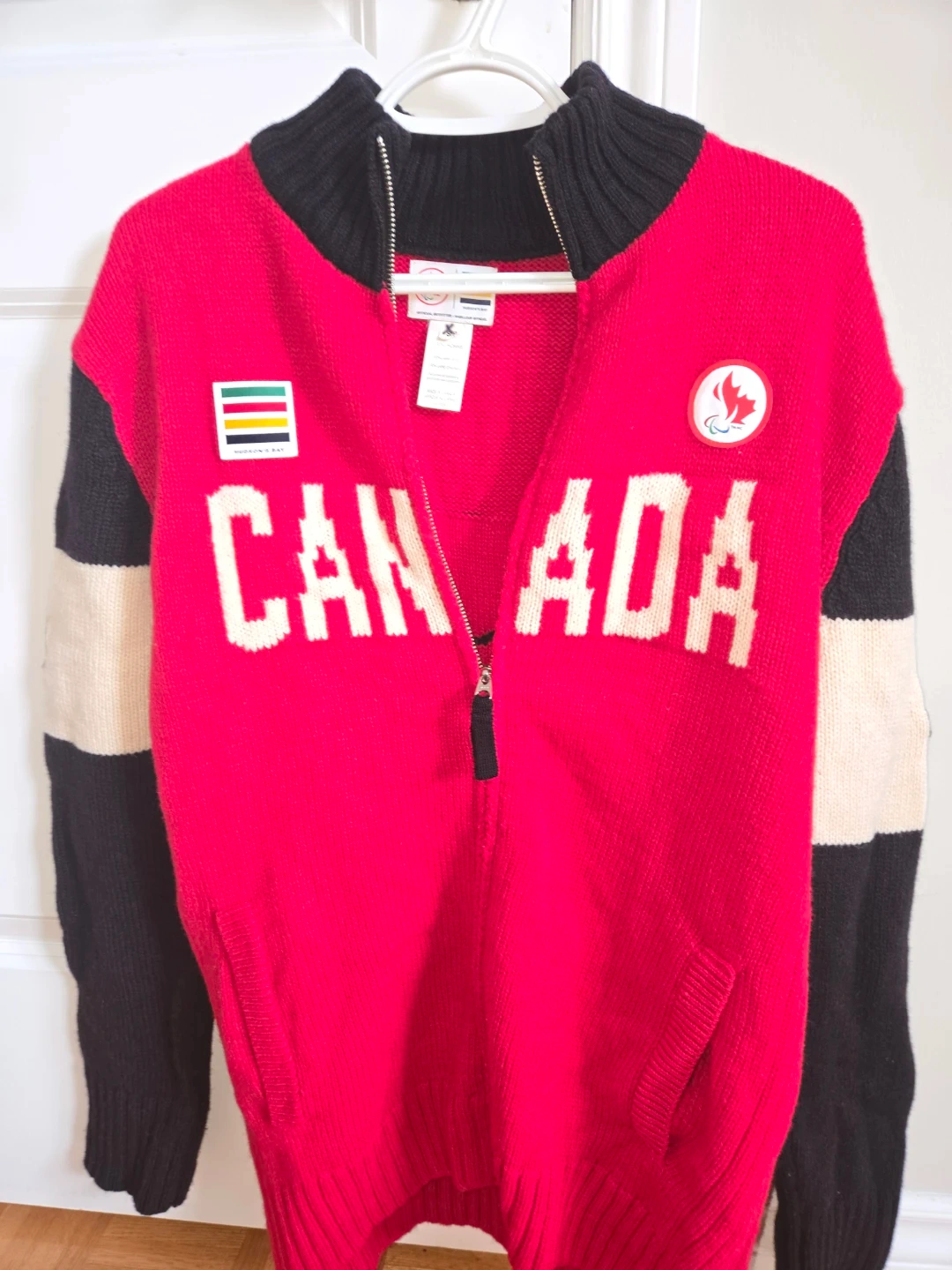 10Selling a Hudson's Bay official outfitter sweater for the 2014 Canadian Paralympic Team! It's a vibrant red with black and cream accents, featuring the Canadian Paralympic Team logo. The sweater has 'CANADA' across the front and a beaver design on the back. It's made of 100% Lambswool and is a size Men small.