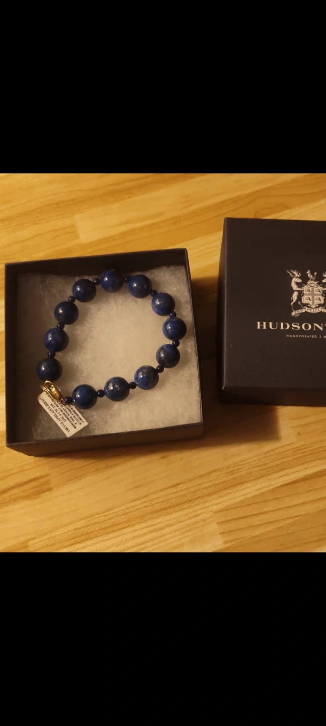 Here's a lovely Hudson's Bay lapis lazuli beaded bracelet! It comes in its original box and would make a beautiful addition to any collection