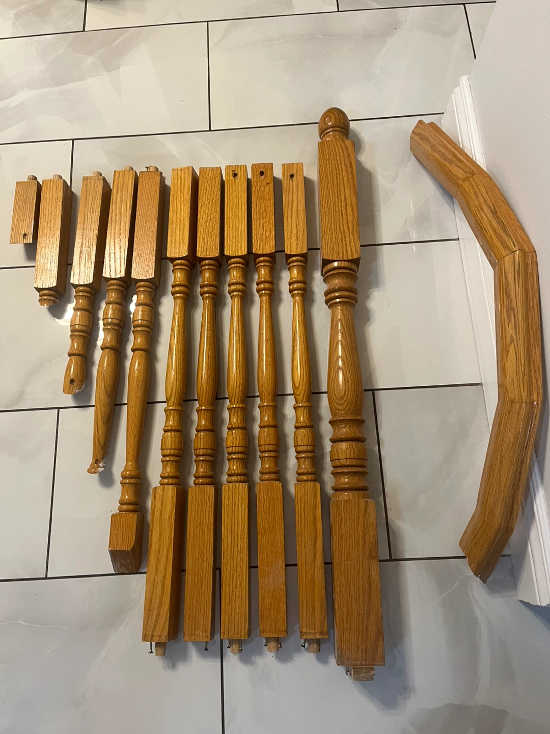 Selling a set of wooden stair railing spindles and a handrail. They are in good condition and ready to be installed. Perfect for a home renovation project!