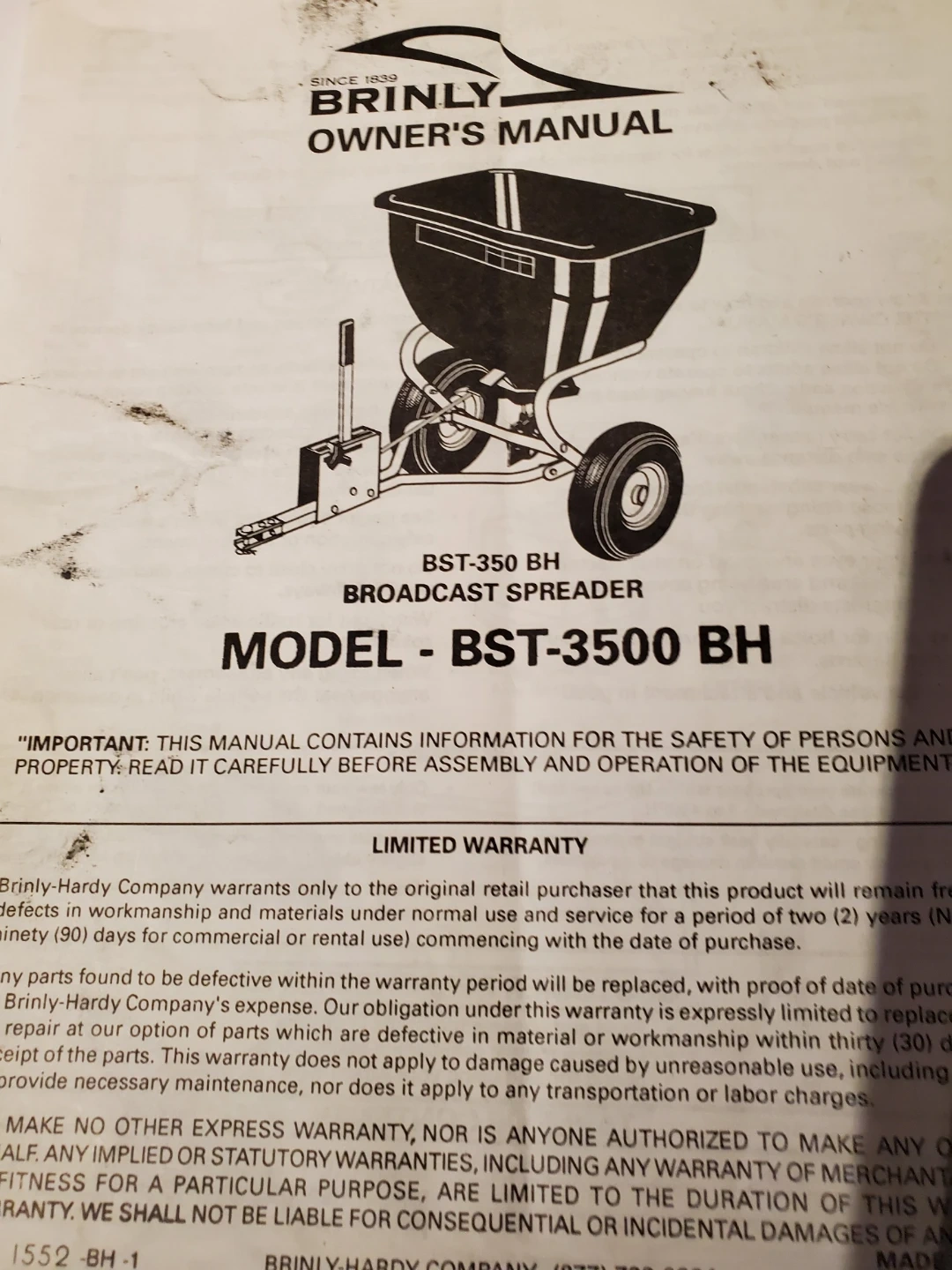 This Brinly broadcast spreader is ready for yard work! It's a BST-3500 BH model. Capacity is 75 lbs and it has pneumatic tires. Good for spreading seed, fertilizer, or salt.