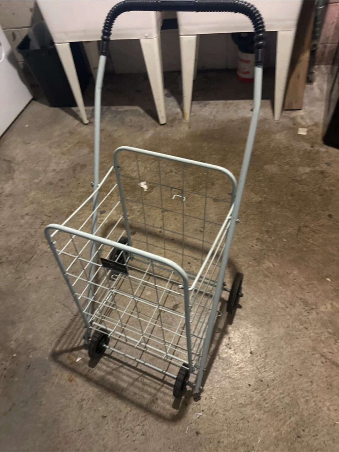 This Reaso Wheels shopping cart is light blue. It's a handy cart for groceries or errands. It's made of metal with a sturdy handle and wheels.