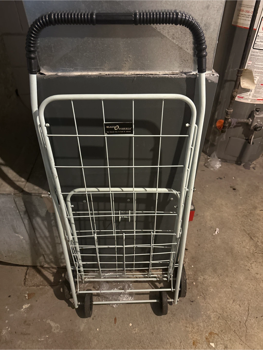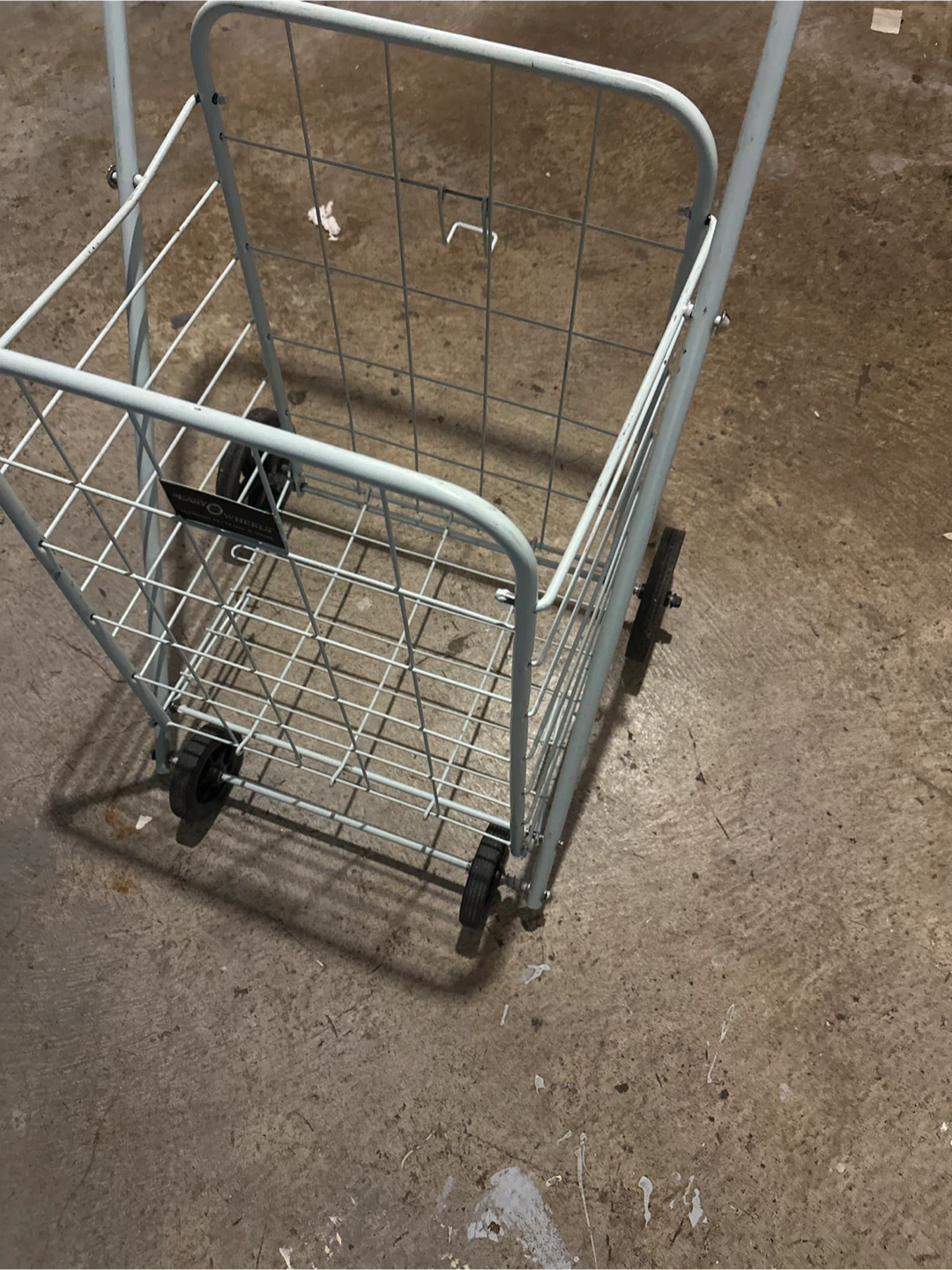 This Reaso Wheels shopping cart is light blue. It's a handy cart for groceries or errands. It's made of metal with a sturdy handle and wheels.