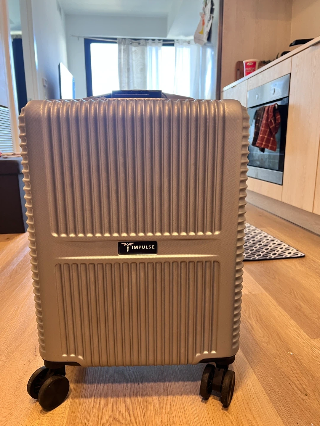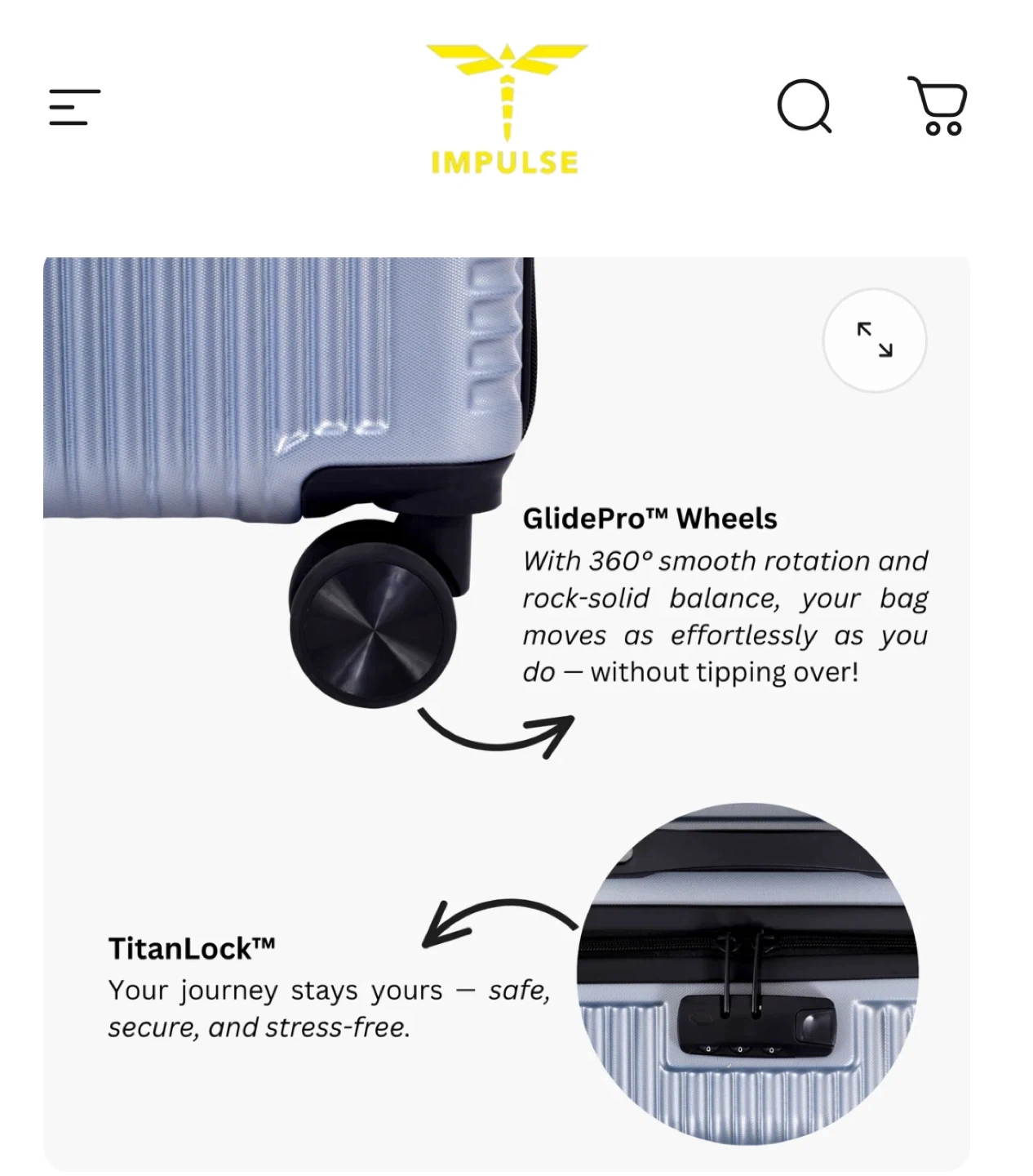 Impulse cabin suitcase with a hard side shell. It's 36L capacity and measures 55 x 36 x 23 cm. Features GlidePro wheels for smooth rotation and a TitanLock for security.