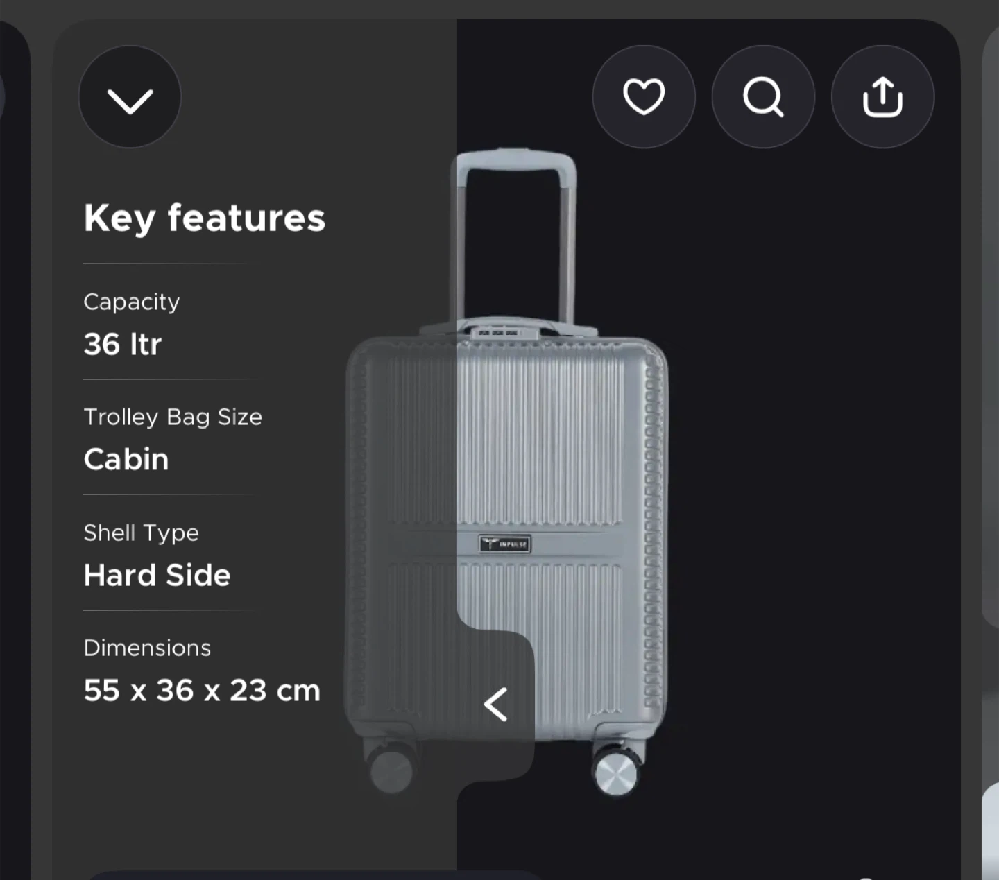 Impulse cabin suitcase with a hard side shell. It's 36L capacity and measures 55 x 36 x 23 cm. Features GlidePro wheels for smooth rotation and a TitanLock for security.