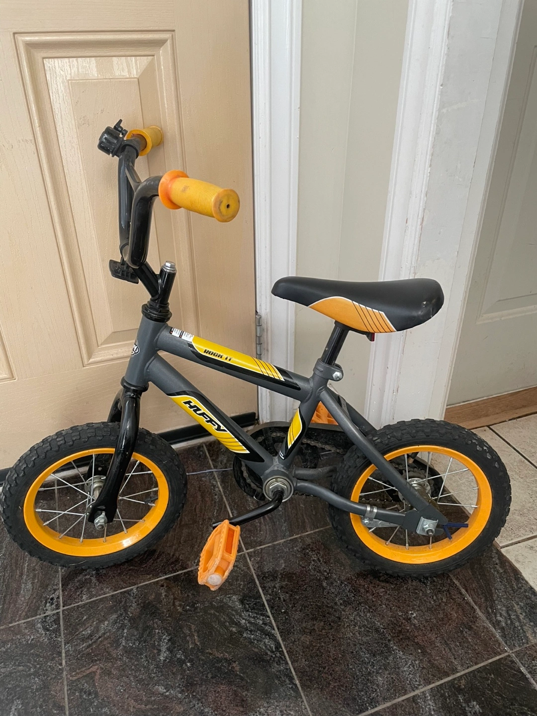 10Grey and yellow kids' bike. Small size, suitable for younger children. Features orange accents and pedals.