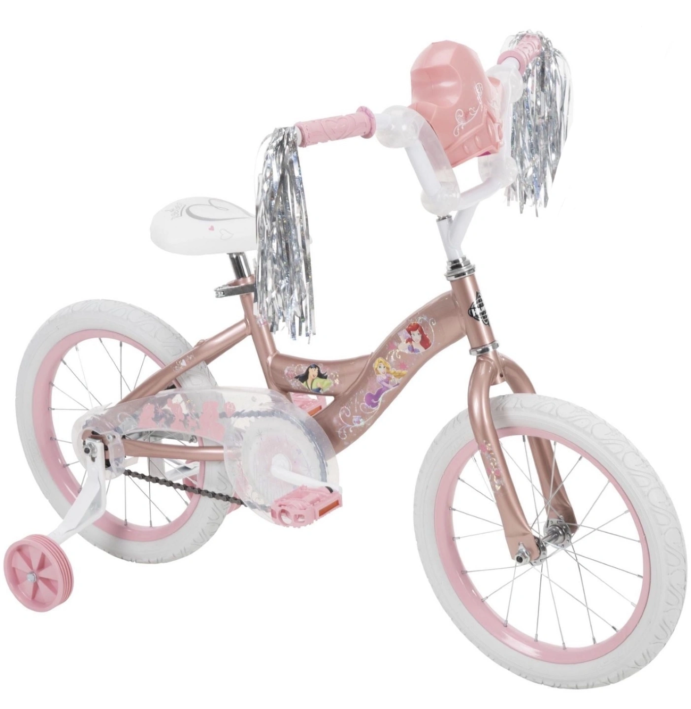Rose gold coloured bike. Features princess decals. Includes training wheels. Pink accents. Comes with a helmet.