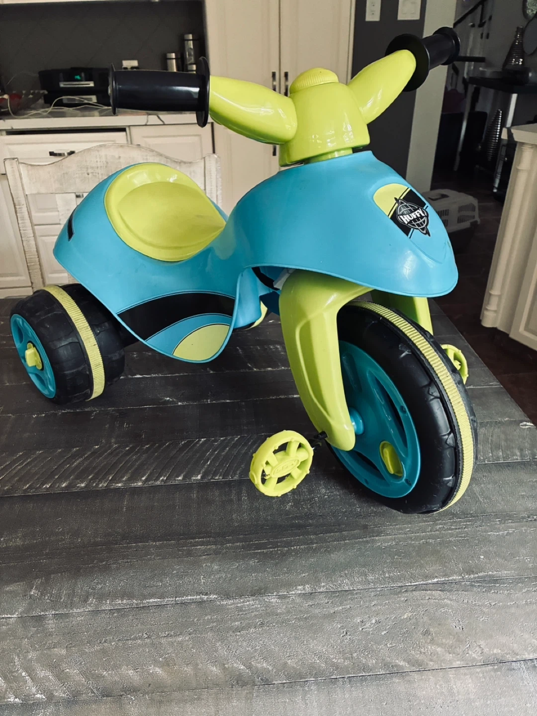 55Here's a cute Huffy tricycle, perfect for toddlers learning to ride! It's a fun mix of blue and green. A little wheel is included too! All charged up and ready to ride