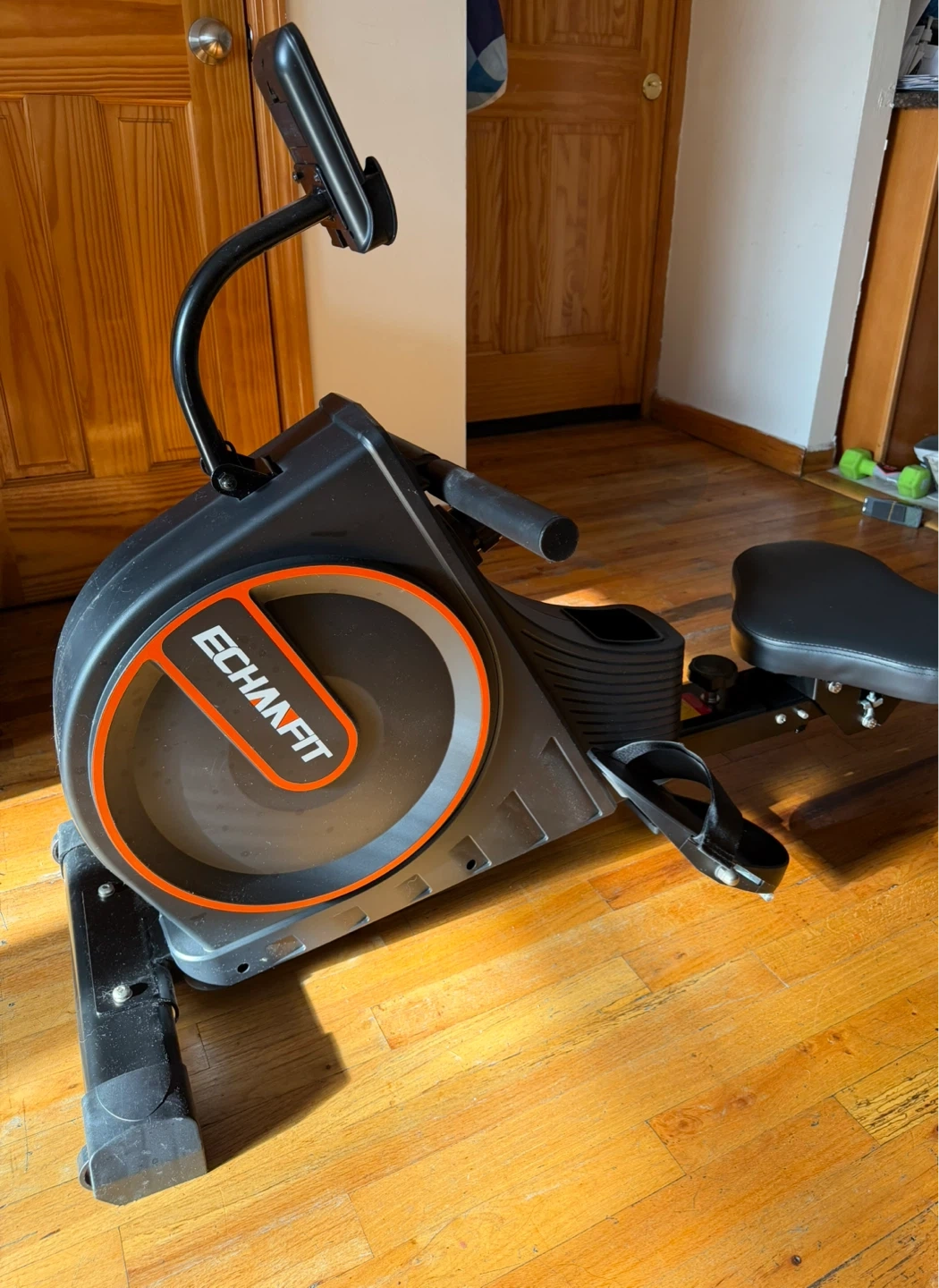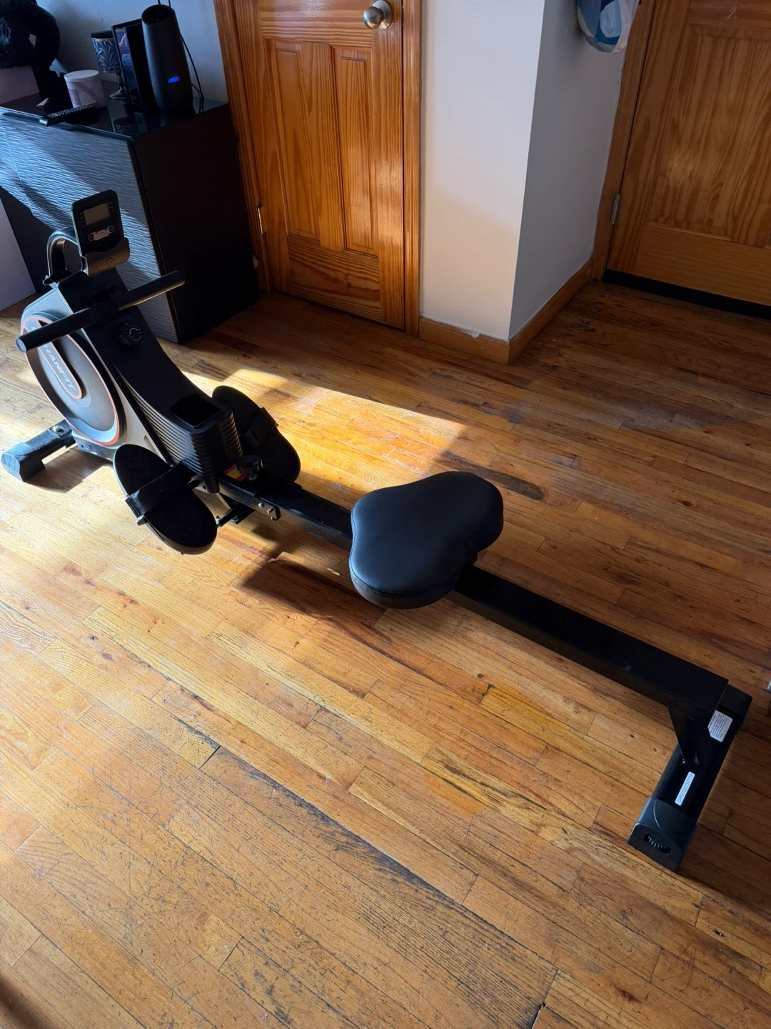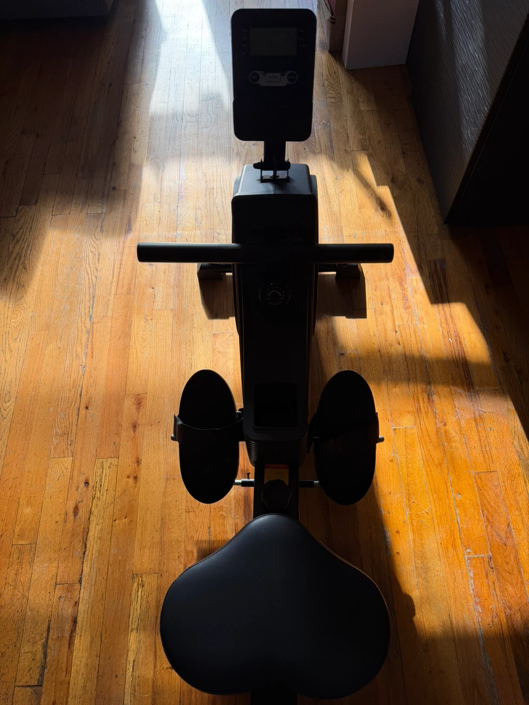 This rowing machine. It's black with orange accents. Includes adjustable foot straps and a digital display. Offers a full-body workout at home! Like new