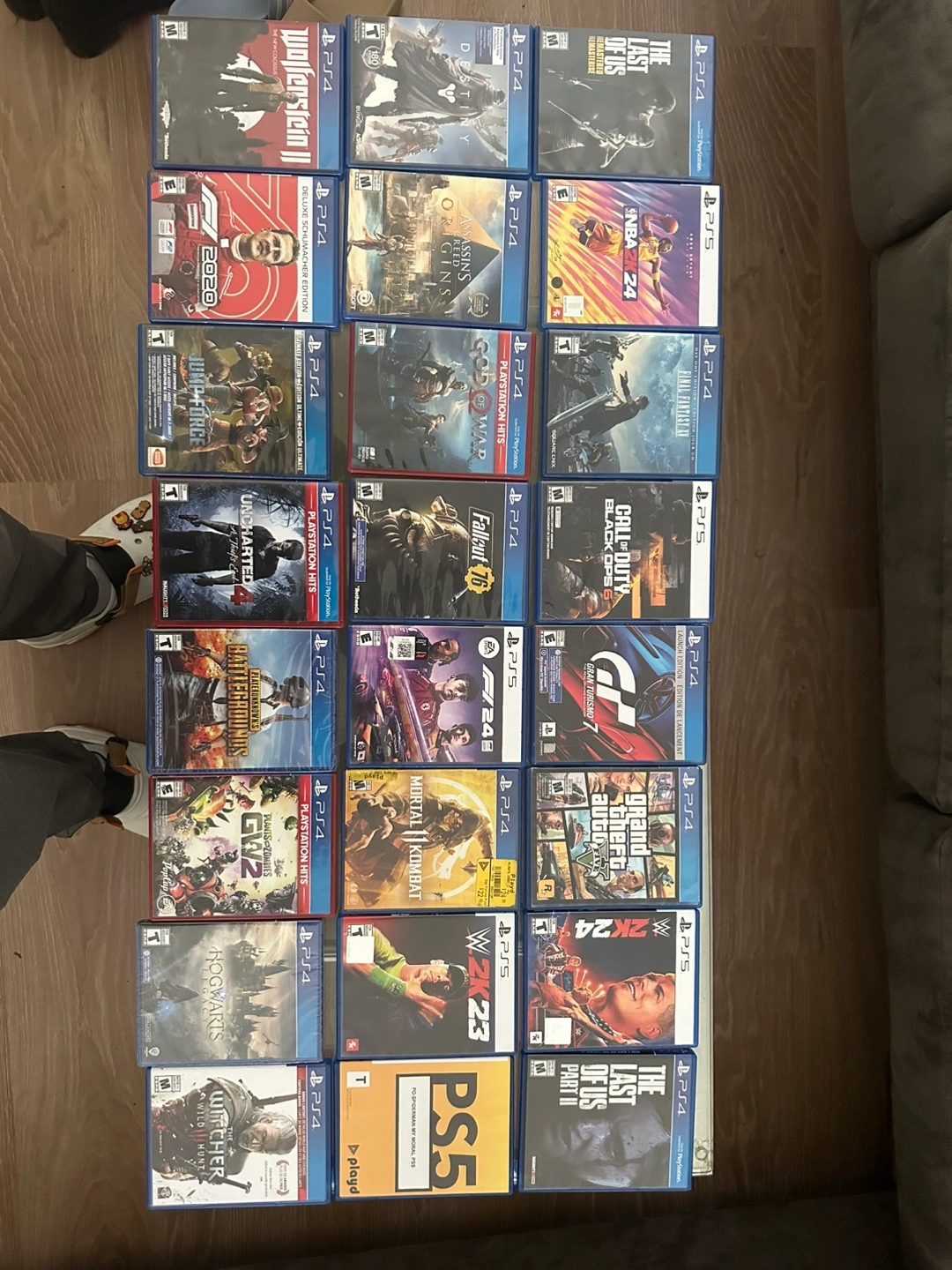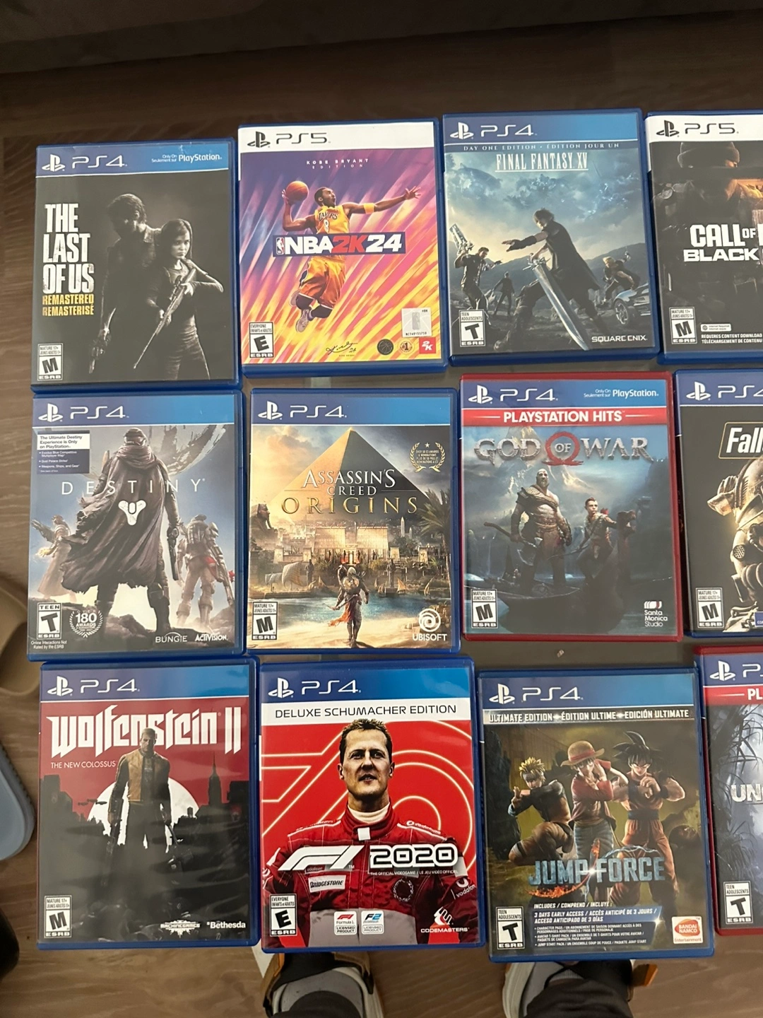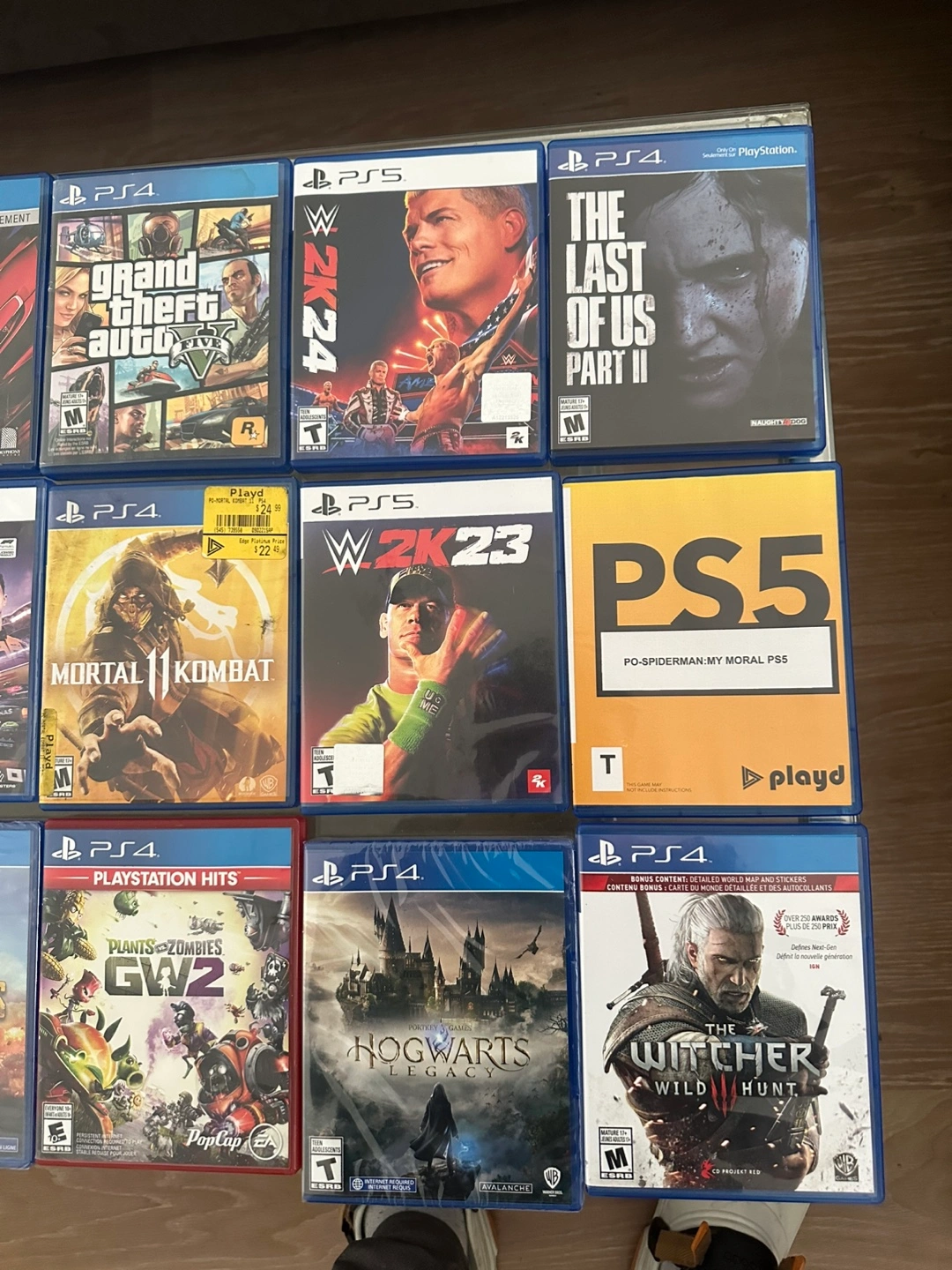 Pickup location - 25 trailwood drive or delivery at reasonable price for 3 or more games. PRICE IS NOT 100$ for all, so please stop asking that. DM me for individual prices , Buy 3 or more in order to get a bundle discount, PS5 games : WWE 2K23 WWE 2K24 Hogwarts legacy Call of duty black ops 6 F124 NBA 2K24 SPIDER-MAN (MILES MORALE) GTA 5 ELDEN RING PS4 GAMES ( also works with PS5) GTA 5 God of war Hogwarts Legacy Gran Turismo Mortal kombat -11 TEKKEN 7 Call of duty black ops3 Need for speed rivals Rise of the tomb raider Horizon zero dawn Watch Dogs 1 Watchdogs -2 Assassin’s creed Odyssey Assassin’screed origins Just cause 3 The last of Us - Remastered The last of Us - 2 Destiny Wolfenstein-2 F1 2020 Final fantasy XV Jump force Fallout 76 Uncharted 4 PUBG (SEALED) Plants vs zombies GW2 The Witcher wild hunt -3